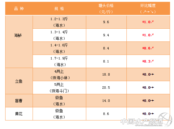 | 中國水產頻道原創報道, 文/ 珠海海龍、水產前沿 吳佳輝 海水特種魚:海鱸價格全面上漲,在新魚上市前還有一定上漲空間 鱸魚:本周鱸魚價格全面上漲,級魚需求級魚增大,存塘減少,拉動中大魚價格,后市預計在新魚上市前,還有一定上漲空間。 立魚 珠海小林:市場出魚量增加,存塘量大,客戶想快速出魚干塘,上市以大規格立魚為主(5兩上)。市場病害較多,客戶恐慌性出魚,預計后市魚價下跌。 珠海斗門:本周立魚行情穩定,目前由于高溫階段,立魚高溫病,鏈球菌爆發,大量客戶魚塘出現死魚情況,投喂率降低,加不上料,推薦方法,使用和生堂新農高磺(磺胺30%)兩包拌一包飼料,同時做好消毒改底方案,快速解決死魚情況,恢復投喂恢復生長,早出魚。 盲曹:目前新魚開始大批出魚,價格保持穩定。 黃花:級魚8.6元,中大魚成數越高價格隨之下降,雖今年放苗少,但珠三角地區受鱸魚存塘多沖擊,價格趨于穩定。 |