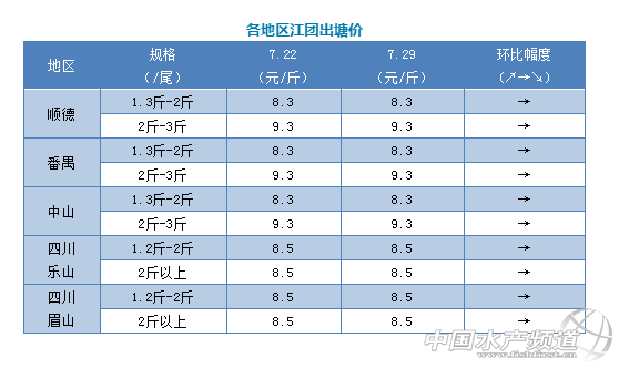 | 中國水產(chǎn)頻道原創(chuàng)報(bào)道, 文/圖 何氏水產(chǎn)、水產(chǎn)前沿 李靜 江團(tuán) 1、廣東江團(tuán)本周價(jià)格持續(xù)保持穩(wěn)定,小魚還是8.3元/斤,中魚9.3元/斤,超大魚沒變還是7元/斤。現(xiàn)在江團(tuán)的存塘量還是在番禺為主,因?yàn)殇N量增長不大,導(dǎo)致價(jià)格也上漲乏力,接下來價(jià)格走勢(shì)還是跟銷量有關(guān),按目前態(tài)勢(shì)預(yù)計(jì),價(jià)格暫時(shí)會(huì)穩(wěn)定。 2、本周四川江團(tuán)大小魚價(jià)格還是與上周一樣,小魚還是8.5元/斤,大魚也是8.5元/斤,現(xiàn)在當(dāng)?shù)卮篝~集中上市,但銷量不大,價(jià)格上漲乏力。小規(guī)格魚量不多但可以滿足市場(chǎng),價(jià)格保持不變,銷量與上周也差不多,預(yù)估價(jià)格暫時(shí)還會(huì)保持穩(wěn)定。 |