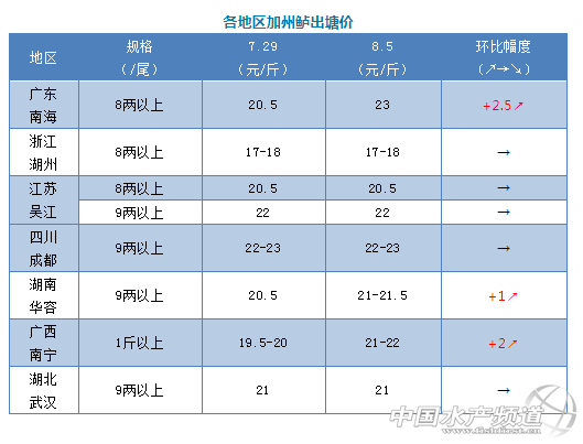 | 中國水產(chǎn)頻道原創(chuàng)報(bào)道, 文/圖 何氏水產(chǎn)、水產(chǎn)前沿 李靜 加州鱸 本周全國加州鱸價(jià)格除廣東南海、廣西南寧、湖南華容三大產(chǎn)區(qū)價(jià)格上漲1-2.5元/斤,其它地區(qū)暫時(shí)保持穩(wěn)定。 1、廣東鱸魚老魚8兩上本周價(jià)格再次暴漲,上漲了2.5元/斤,達(dá)到23元/斤,現(xiàn)在沙頭產(chǎn)區(qū)老魚價(jià)格比較亂,有些統(tǒng)貨開塘價(jià)22元/斤,22.5元/斤也有,8兩以上23元/斤,由于現(xiàn)在外省偏大魚不多,部分水車都到廣東拉魚,導(dǎo)致偏大魚貨源緊張,價(jià)格一路上漲。目前存塘老魚還是以沙頭產(chǎn)區(qū)為主,都是以偏大魚為主,超大魚從1成-3成不等。外區(qū)還是有部分少量反季節(jié)魚上市,但數(shù)量還是不多,價(jià)格與現(xiàn)在老魚價(jià)格相差2元/斤,本周外圍新魚陸續(xù)上市,數(shù)量比上周多,最大魚頭在1.2斤左右,7兩以上價(jià)格比上周上漲了1元/斤,達(dá)到18元/斤左右,魚頭越大價(jià)格越高。 2、浙江湖州鱸魚價(jià)格還是出統(tǒng)貨為主,8兩以上價(jià)格本周與上周一樣,還是17-18元/斤,統(tǒng)貨價(jià)格16-16.5元/斤,當(dāng)?shù)剡_(dá)上市規(guī)格的存塘舊魚很少,基本很少出魚。江蘇吳江本周價(jià)格與上周一樣,8兩以上報(bào)價(jià)20.5元/斤,9兩以上22元/斤,本地由于偏大魚頭不多,又是高溫天氣,現(xiàn)在養(yǎng)戶出魚積極性不高,本地出魚量不多。四川成都本周報(bào)價(jià)格還是22-23元/斤,與上周一樣,老魚存塘量量少,價(jià)格上漲養(yǎng)戶出魚積極性加強(qiáng)。湖南華容本周價(jià)格也比上周也上漲了1元/斤,本地大規(guī)格魚已經(jīng)不多,外地水車到本地拉魚量增多,搶高了魚價(jià)。湖北武漢本周價(jià)格與上周價(jià)格一樣,9兩上還是21元/斤,銷量與上周差不多。廣西南寧由于老魚數(shù)量也不多,價(jià)格也上漲了2元/斤,出魚量也不大。 |