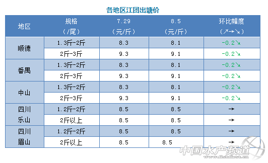 2、本周四川江團大小魚價格還是與上周一樣,小魚還是8.5元/斤,大魚也是8.5元/斤,現在當地大魚集中上市,本周銷量比上周增長了,有從本地將魚拉到北京、西安等地銷售,由于存塘量還能滿足現在銷量,價格暫時保持穩定。