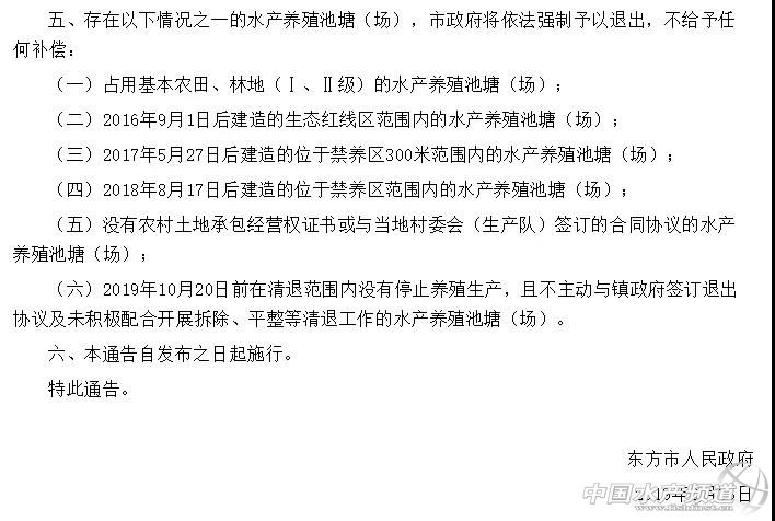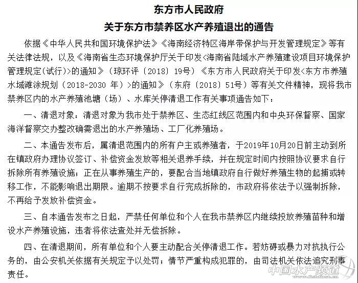 來源:央視網(wǎng)、東方心生活、青海省農(nóng)業(yè)農(nóng)村廳辦公室、黑龍江日?qǐng)?bào)、農(nóng)民日?qǐng)?bào) 農(nóng)業(yè)農(nóng)村部:我國(guó)漁業(yè)主產(chǎn)區(qū)全面實(shí)施新一輪養(yǎng)殖水域?yàn)┩恳?guī)劃 中國(guó)水產(chǎn)頻道報(bào)道,今年上半年,農(nóng)業(yè)農(nóng)村部指出,我國(guó)漁業(yè)主產(chǎn)區(qū)將全面實(shí)施新一輪養(yǎng)殖水域?yàn)┩恳?guī)劃。據(jù)介紹,我國(guó)水產(chǎn)養(yǎng)殖主產(chǎn)縣的水域?yàn)┩恳?guī)劃編制工作已基本完成。從今年開始,我國(guó)漁業(yè)主產(chǎn)區(qū)將全面實(shí)施新一輪養(yǎng)殖水域?yàn)┩恳?guī)劃。 養(yǎng)殖水域?yàn)┩恳?guī)劃,是指國(guó)家對(duì)水域利用進(jìn)行統(tǒng)一規(guī)劃,對(duì)可以用于水產(chǎn)養(yǎng)殖業(yè)的水域?yàn)┩縿澐殖鰜恚y(tǒng)籌發(fā)展水產(chǎn)養(yǎng)殖生產(chǎn)。 農(nóng)業(yè)農(nóng)村部漁業(yè)漁政管理局養(yǎng)殖處處長(zhǎng)陳家勇:“本次規(guī)劃有兩個(gè)主要特點(diǎn):第一強(qiáng)調(diào)生態(tài)優(yōu)先,把生態(tài)環(huán)境保護(hù)放在一個(gè)很重要的位置;第二方面強(qiáng)調(diào)‘多規(guī)合一’,就是說我們的規(guī)劃跟我們國(guó)土空間的其它規(guī)劃是相互銜接的、有效的一個(gè)整體,不會(huì)相互出現(xiàn)沖突。” 陳家勇介紹說,為了保護(hù)生態(tài),本輪規(guī)劃特別提出了飲用水水源地、自然保護(hù)區(qū)等重要生態(tài)保護(hù)或公共安全“紅線”和“黃線區(qū)域作為禁止或限制養(yǎng)殖區(qū)。 為使水產(chǎn)養(yǎng)殖更加體現(xiàn)因地制宜、合理布局,本輪規(guī)劃提出,要穩(wěn)定海水池塘和工廠化養(yǎng)殖,調(diào)減過密近海網(wǎng)箱養(yǎng)殖,發(fā)展外海深水網(wǎng)箱養(yǎng)殖,穩(wěn)定淡水池塘養(yǎng)殖,調(diào)減湖泊水庫(kù)網(wǎng)箱圍欄養(yǎng)殖,支持設(shè)施養(yǎng)殖向工廠化循環(huán)水方向發(fā)展。 東方市人民政府:關(guān)于東方市禁養(yǎng)區(qū)水產(chǎn)養(yǎng)殖退出的通告 點(diǎn)擊查看大圖 安徽:44個(gè)保護(hù)區(qū)即將全面禁捕 記者從有關(guān)部門獲悉,為強(qiáng)化水生生物資源養(yǎng)護(hù),該省提出今年底前,44個(gè)水生生物保護(hù)區(qū)要完成漁民退捕,率先實(shí)現(xiàn)全面禁捕;2020年底前,長(zhǎng)江干流、重要支流要完成漁民退捕,實(shí)施為期10年的常年禁捕。 據(jù)介紹,在重點(diǎn)水域?qū)嵤┏D杲叮顷P(guān)系眾多漁民切身利益的民生工程。安徽省提出,各地要細(xì)化方案,確保禁捕政策按期穩(wěn)妥實(shí)施。在明確任務(wù)的同時(shí),要摸清底數(shù),健全退捕漁民漁船臺(tái)賬。實(shí)行動(dòng)態(tài)管理精準(zhǔn)到船到戶。 與此同時(shí),安徽省規(guī)定,各地要全力保障退捕漁民基本生計(jì),要加快完善配套措施,強(qiáng)化社會(huì)保障兜底。重點(diǎn)關(guān)注“以船為家”以及無再就業(yè)能力等特殊漁民群體。長(zhǎng)江禁捕政策性強(qiáng),確保穩(wěn)定是工作底線,要及時(shí)回應(yīng)群眾訴求,避免發(fā)生群體性事件。積極引導(dǎo)退捕漁民轉(zhuǎn)產(chǎn)轉(zhuǎn)業(yè)。開展就業(yè)創(chuàng)業(yè)技能培訓(xùn),落實(shí)“雙創(chuàng)”支持政策,優(yōu)化漁民就業(yè)創(chuàng)業(yè)環(huán)境。要健全多部門、跨區(qū)域聯(lián)合執(zhí)法的協(xié)調(diào)機(jī)制,組織實(shí)施好專項(xiàng)執(zhí)法和聯(lián)合執(zhí)法行動(dòng)。 此外,安徽省還提出,各地要加快落實(shí)養(yǎng)殖水域?yàn)┩恳?guī)劃制度。進(jìn)一步加快規(guī)劃發(fā)布工作,沒有發(fā)布的主產(chǎn)縣及市級(jí)規(guī)劃要盡快發(fā)布。依法加強(qiáng)養(yǎng)殖水域?yàn)┩恳?guī)劃的用途管制,到2020年底,依法拆除禁養(yǎng)區(qū)養(yǎng)殖設(shè)施和減少限養(yǎng)區(qū)養(yǎng)殖污染要取得明顯成效,養(yǎng)殖區(qū)水域?yàn)┩看_權(quán)頒證工作要基本完成。 青海:十部門聯(lián)合印發(fā)《實(shí)施方案》,十項(xiàng)措施推進(jìn)漁業(yè)養(yǎng)殖綠色有機(jī)發(fā)展 7月9日,青海省農(nóng)業(yè)農(nóng)村廳、省生態(tài)環(huán)境廳、省自然資源廳、省發(fā)展改革委員會(huì)等10部門聯(lián)合印發(fā)《青海省加快漁業(yè)養(yǎng)殖綠色有機(jī)發(fā)展的實(shí)施方案》,要求圍繞統(tǒng)籌推進(jìn)“五位一體”總體布局,奮力推進(jìn)“一優(yōu)兩高”戰(zhàn)略,以實(shí)施鄉(xiāng)村振興戰(zhàn)略為引領(lǐng),以漁業(yè)供給側(cè)結(jié)構(gòu)性改革為主線,以實(shí)現(xiàn)漁業(yè)綠色有機(jī)發(fā)展為目標(biāo),加快構(gòu)建漁業(yè)養(yǎng)殖綠色有機(jī)發(fā)展的空間格局、產(chǎn)業(yè)結(jié)構(gòu)和生產(chǎn)方式的新形勢(shì)。 《方案》提出,緊緊圍繞高質(zhì)量發(fā)展,堅(jiān)持質(zhì)量興漁,堅(jiān)持市場(chǎng)導(dǎo)向,堅(jiān)持創(chuàng)新驅(qū)動(dòng),堅(jiān)持依法治漁,大力發(fā)展具有高原特色、綠色、優(yōu)質(zhì)、生態(tài)的水產(chǎn)品。充分發(fā)揮市場(chǎng)在資源配置中的決定性作用,優(yōu)化資源配置,增強(qiáng)發(fā)展活力,提升綠色養(yǎng)殖綜合效益。加強(qiáng)水產(chǎn)養(yǎng)殖業(yè)綠色發(fā)展體制機(jī)制創(