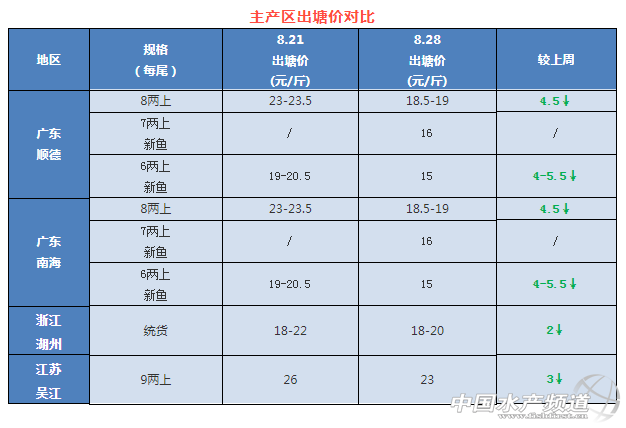 | 中國水產(chǎn)頻道原創(chuàng)報道, 各產(chǎn)區(qū)加州鱸最新塘頭報價與行情一周簡析 文/圖 杰大飼料 水產(chǎn)前沿 李曉欣 聯(lián)合發(fā)布 經(jīng)歷了前幾個月魚價的猛漲,近期加州鱸價格似乎進入了“過山車”般的下坡階段,降幅之快如同此前漲價時讓人驚嘆。今天廣東佛山8兩上舊魚報價18.5-19元/斤,相比上周價格下降了4.5元/斤;新魚6兩上報價15元/斤,7兩上16元/斤,一周降幅達4-5.5元/斤。 據(jù)悉,近期魚價回落一方面是由于禁漁期結(jié)束,市場銷量有所下滑;另一方面是新魚上市量有所增多,魚價持續(xù)下滑之下,一部分養(yǎng)戶心里也出現(xiàn)恐慌,急著出魚。受廣東魚價下跌和新魚上市增多影響,其他產(chǎn)區(qū)魚價也下跌了0.5-4元/斤不等。業(yè)內(nèi)人士提醒,養(yǎng)戶應(yīng)理性看待魚價走勢,根據(jù)自身情況合理安排出魚時機,切勿恐慌出售。 今日各地加州鱸塘頭價及本周行情分析 廣東順徳:今天報價舊魚8兩上18.5-19元/斤,新魚6兩上15元/斤左右,7兩上16元/斤左右,實際發(fā)價需要到現(xiàn)場圍魚,看魚頭大小才報價,要求有一定規(guī)格的魚頭。本周魚價回調(diào),少部分養(yǎng)殖戶過于心急都想嘗試出魚賣得高價,但臺風(fēng)前后天氣反復(fù),大家應(yīng)根據(jù)自己實際情況合理安排出魚時間,確保養(yǎng)殖收益。 廣東南海:今天報價舊魚18.5-19元/斤,價錢回落的速度超出預(yù)期,對沙頭本地還有少部分舊魚存塘的養(yǎng)殖戶影響比較大,目前新魚上市對舊魚價格帶來一定的沖擊,新魚報價6兩上15元/斤左右,7兩上16元/斤左右,實際塘頭價因魚頭規(guī)格不同有所波動。臺風(fēng)過后,新魚上市量比之前有所增加,部分養(yǎng)殖戶想趕早賣個好魚價。 浙江湖州:湖州統(tǒng)貨報價18-20元/斤,比上周價格跌了2元/斤,主要是受廣東和江蘇魚價下跌影響,魚價當(dāng)?shù)乩峡诖嫣翗O少,基本很少出魚。 江蘇吳江:今天吳江9兩上鱸魚報價23元/斤,相比上周魚價下跌了3元/斤,當(dāng)?shù)卮a頭水車大多已經(jīng)停了,收魚量大減,加上受廣東魚價下跌影響,吳江本地魚價也有所回落。 四川成都:今天報價9兩上魚價24-24.5元/斤,比上周下滑了0.5元/斤。目前當(dāng)?shù)卮嫣晾峡诤苌伲卖~未上市,所以本地魚車基本要到外地收魚。 湖北武漢:武漢8兩上報價21元/斤左右,本地老口存塘極少,新魚還未達上市規(guī)格。 湖南華容:華容9兩上鱸魚報價20-21元/斤,比上周下跌了3元/斤,當(dāng)?shù)乩峡邝|魚已快清完,受廣東魚價下跌影響,本地魚價走低。 安徽青陽:今天報價9兩上23元/斤,受廣東新魚上市影響,魚價相比上周高峰下降2元/斤。目前青陽老口數(shù)量存塘不多,僅有5分之一,魚價下跌后大多數(shù)養(yǎng)戶對后市魚價不看好,出魚積極性較高。 廣西南寧:今天南寧1斤上加州鱸報價20元/斤,一周下跌了2-4元/斤,貴州有水車到本地裝網(wǎng)箱魚,8兩上19.5-20元/斤。 |