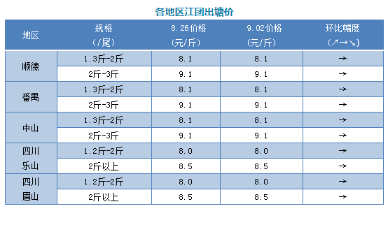 1、廣東江團本周價格與上周相比,大小魚價格還是持平,小魚還是8.1元/斤,中魚還是9.1元/斤,超大魚沒變還是7元/斤。現在江團的存塘量還是出順德為主,番禺為副,偏大魚比較多,上漲空間還是沒有出現,現在接近中秋,氣溫也相對下降一點,預估下周銷量比上漲。