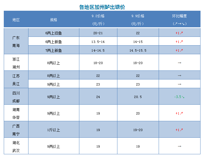 | 中國水產頻道原創報道, 文/圖 何氏水產、水產前沿 李靜 加州鱸 本周廣東、湖南、廣西加州鱸價格比上周都上漲了1元/斤,成都價格下跌了3.5元/斤,其他產區價格與上周一樣。 1、廣東鱸魚老魚本周繼續上漲,6兩以上老魚價格比上周漲了1元/斤,達到22元/斤,大魚緊缺。現在還是出沙頭產區的老魚,庫存剩下十幾塘。新魚大量上市了,大魚頭數量還是不多,本周價格漲了1元/斤,6兩以上14-15元/斤,7兩以上14.5-15.5元/斤,魚頭1.0斤左右的13元/斤,魚頭越大價格越高,現在新魚成交價也比較亂,主要看魚頭定價。本周是上中秋節的量,11-13號這三天銷量會上漲30%,節后會回到正常水平。 2、浙江湖州鱸魚價格還是出統貨為主,8兩以上價格與上周持平,還是18-20元/斤,銷量不多,最終成交價看魚頭來定。江蘇吳江價格先漲后跌,現在報價與上周一樣,8兩以上報價還是22元/斤,9兩以上價格還是23元/斤。四川成都本周報價比上周下跌了3.5元/斤,只有20.5元/斤,當地老魚存塘量不多,新魚還沒出來。廣西南寧、湖南華容兩個產區在上周價格暴跌后本周上漲了1元/斤,湖北武漢價格與上周一樣。 |