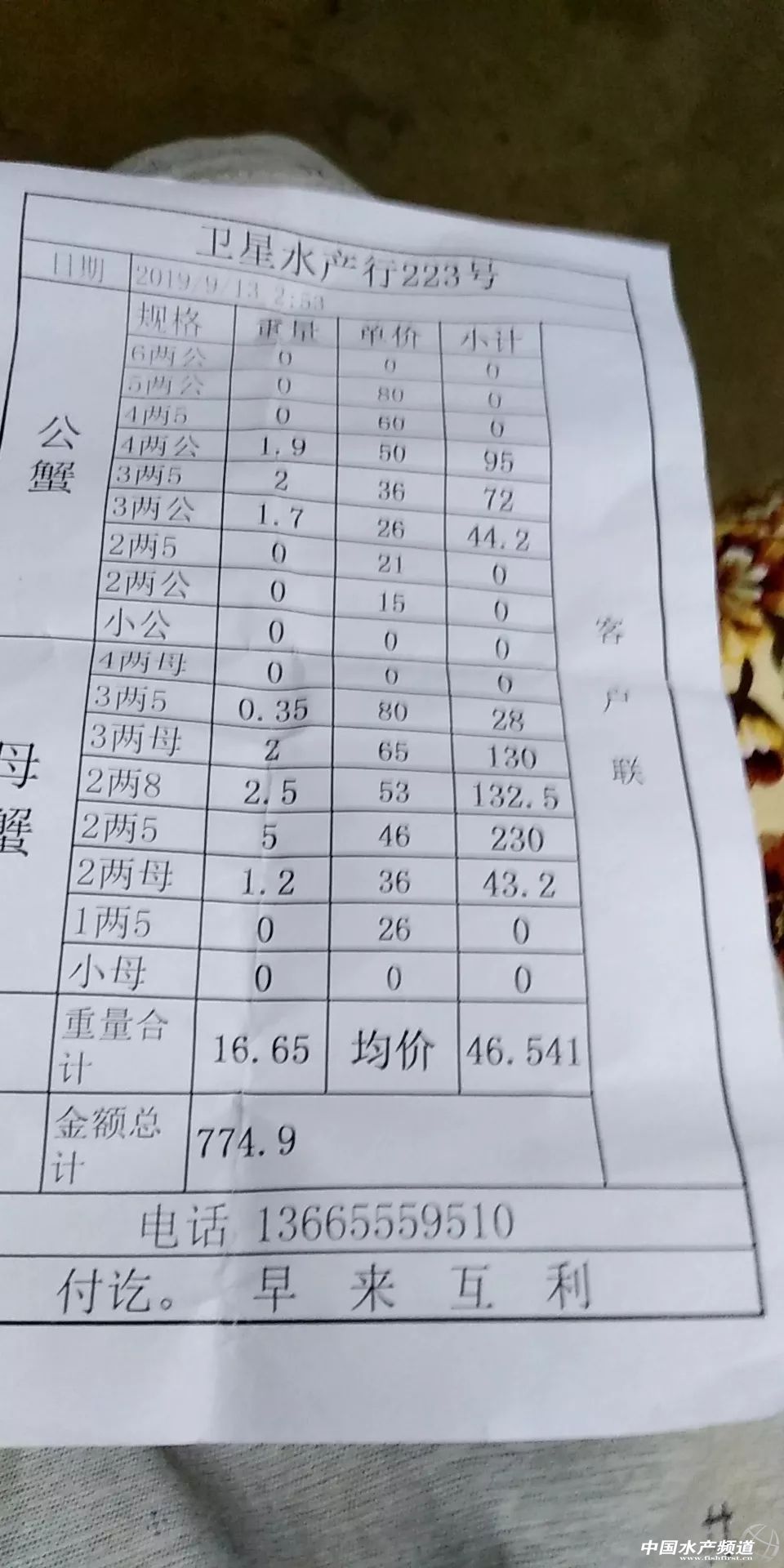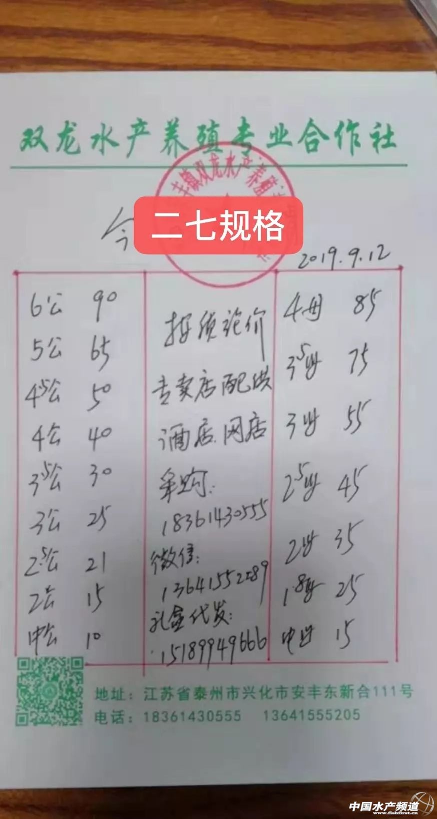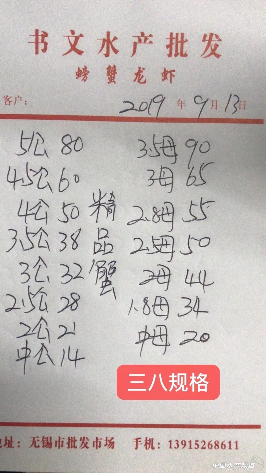 | 中國水產頻道原創報道, 做國內最中立的報價平臺,不被利益綁架,讓養殖者、流通商、零售商與消費者都能第一時間了解最真實的價格與供求數據。 行情分析 與昨天相比,興化行情整體下跌,大規格蟹普遍下跌5元/斤,小規格蟹跌1-2元/斤。如6兩公蟹跌10元/斤,跌價最多。 高淳普通門市漲跌互現,大規格蟹漲,小規格母蟹微跌。如4公漲3元/斤,2母跌1元/斤。 高淳部分高價門市(收精品蟹),3.5公以上和2.5母以上規格補(加)錢4元一斤!3公以下和2母以下補錢2元一斤! 今日交易價 高淳 此報價單由江蘇好潤固城湖店劉坤提供 此報價單由江蘇好潤固城湖店劉坤提供 今日參考價 興化 此報價由江蘇好潤馬家蕩店宋利坤提供 高淳 此報價由江蘇好潤固城湖店劉坤提供 此報價由江蘇好潤固城湖店劉坤提供 盤錦 此報價單由盤錦王老板提供 泗洪 此報價由泗洪孫老板提供 建湖 此報價由江蘇好潤馬家蕩店宋利坤提供 馬鞍山 此報價由江蘇好潤塘南店張悅提供 無錫 |