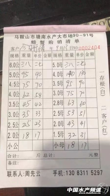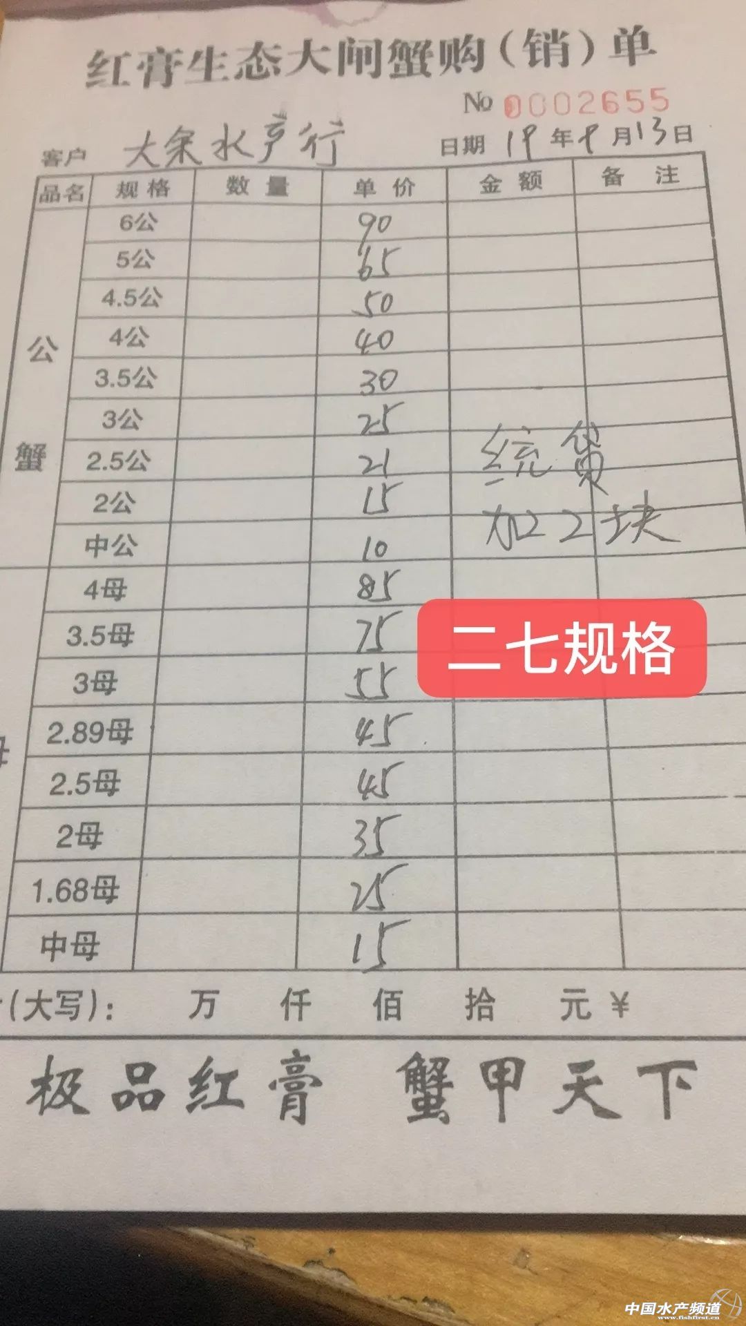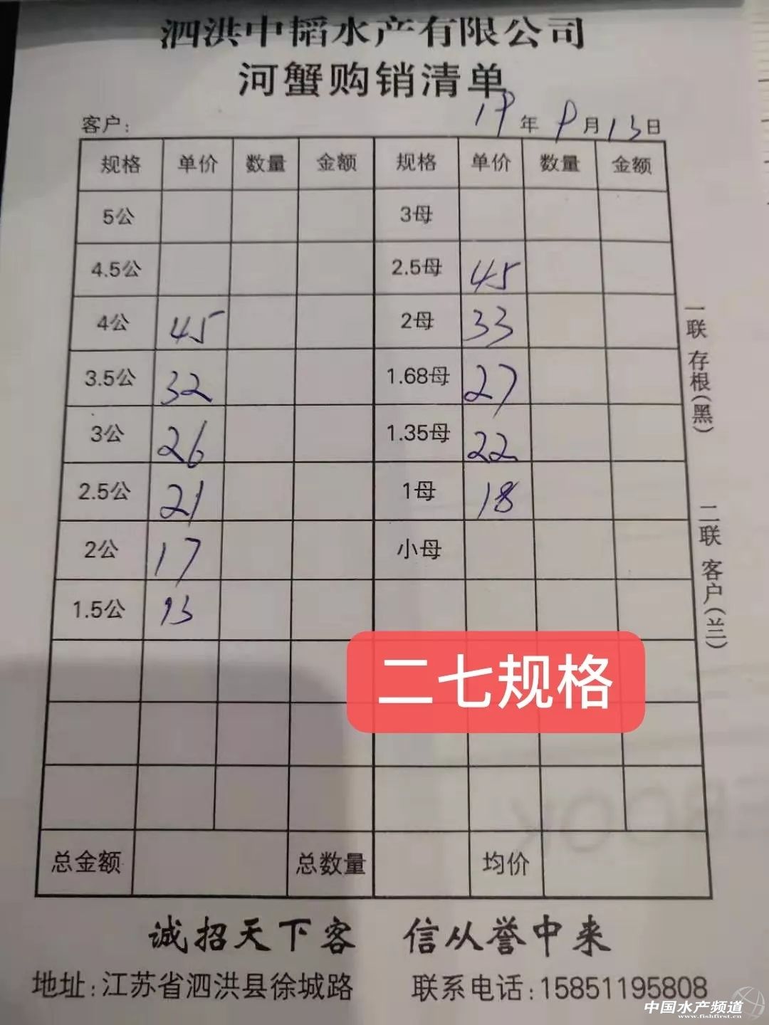 | 中國水產頻道原創報道, 做國內最中立的報價平臺,不被利益綁架,讓養殖者、流通商、零售商與消費者都能第一時間了解最真實的價格與供求數據。 行情分析 與昨天相比,興化行情整體下跌,大規格蟹普遍下跌5元/斤,小規格蟹跌1-2元/斤。如6兩公蟹跌10元/斤,跌價最多。 高淳普通門市漲跌互現,大規格蟹漲,小規格母蟹微跌。如4公漲3元/斤,2母跌1元/斤。 高淳部分高價門市(收精品蟹),3.5公以上和2.5母以上規格補(加)錢4元一斤!3公以下和2母以下補錢2元一斤! 今日交易價 高淳 此報價單由江蘇好潤固城湖店劉坤提供 此報價單由江蘇好潤固城湖店劉坤提供 今日參考價 興化 此報價由江蘇好潤馬家蕩店宋利坤提供 高淳 此報價由江蘇好潤固城湖店劉坤提供 此報價由江蘇好潤固城湖店劉坤提供 盤錦 此報價單由盤錦王老板提供 泗洪 此報價由泗洪孫老板提供 建湖 此報價由江蘇好潤馬家蕩店宋利坤提供 馬鞍山 此報價由江蘇好潤塘南店張悅提供 無錫 |