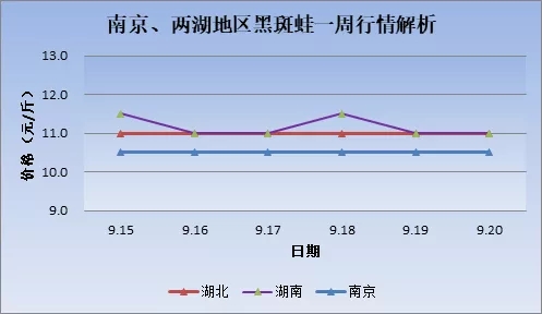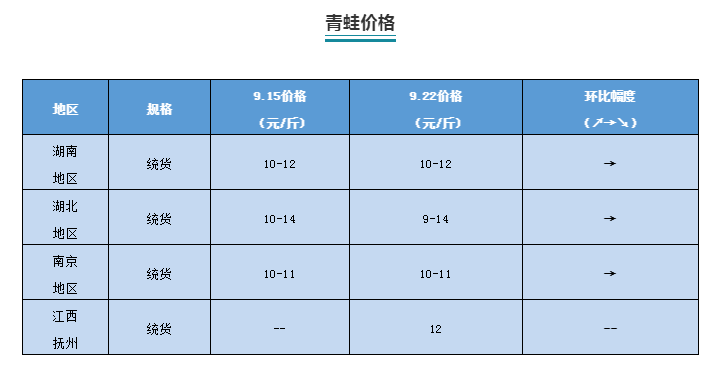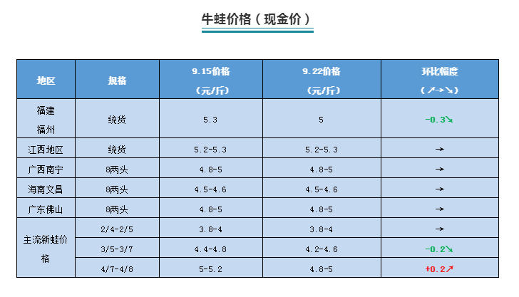 | 中國水產頻道原創報道, 本周牛蛙、黑斑蛙、泰蛙最新行情報價 文/ 水產前沿 陳曉慶 一周行情簡析 牛蛙 本周福建牛蛙價格穩中有跌,今日牛蛙現金價5元/斤,欠賬5.4元/斤。江西、廣西、海南等地牛蛙價格保持穩定,廣西南寧8兩頭4.8-5元/斤,江西地區5.2-5.3元/斤,海南文昌4.5-4.6元/斤,廣東佛山4.8-5元/斤,與上周持平。 目前各地區牛蛙價格仍然處于低價位,即使處于雙節期間也難見起色。近期市場對于大蛙的需求較大,且存量不多,價格有所上調,相比上周上漲了0.2元/斤。中小規格的新蛙由于市場存量過多,市場需求較小,價格微跌。 去年14元/斤的高蛙價驅使著很多養殖戶盲目擴張或是入行,僅廣西今年就擴增了一萬五千多畝,養殖過熱才導致了后市行情的低迷。目前很多養殖戶選擇惜售等待價格,期待國慶節期間能夠有所上漲,但也有業內人士認為,目前的惜售可能會導致后期的集中上市,加上大家都希望能夠在澄海新蛙上市前把蛙賣出,價格想要上漲還是很難。 泰國虎紋蛙 本周廣西泰蛙價格終于觸底反彈,海南、廣東地區泰蛙價格依舊保持穩定。廣西泰蛙近兩天升價1-2毛,南寧本周報價3.5-3.6元/斤,漲價的苗頭開始浮現。據悉,廣東本地上半年早批泰蛙都是5月份左右下苗,8至9月份中旬前為出蛙高峰期,加上9月份要清欄下冬批苗,才導致近期市場上泰蛙過多,價格低迷。據統計,目前廣東泰蛙存欄量同比8月份已減少50%以上,加上國慶假日來臨消費量增加,近期蛙價有望上漲。 青蛙(黑斑蛙) |