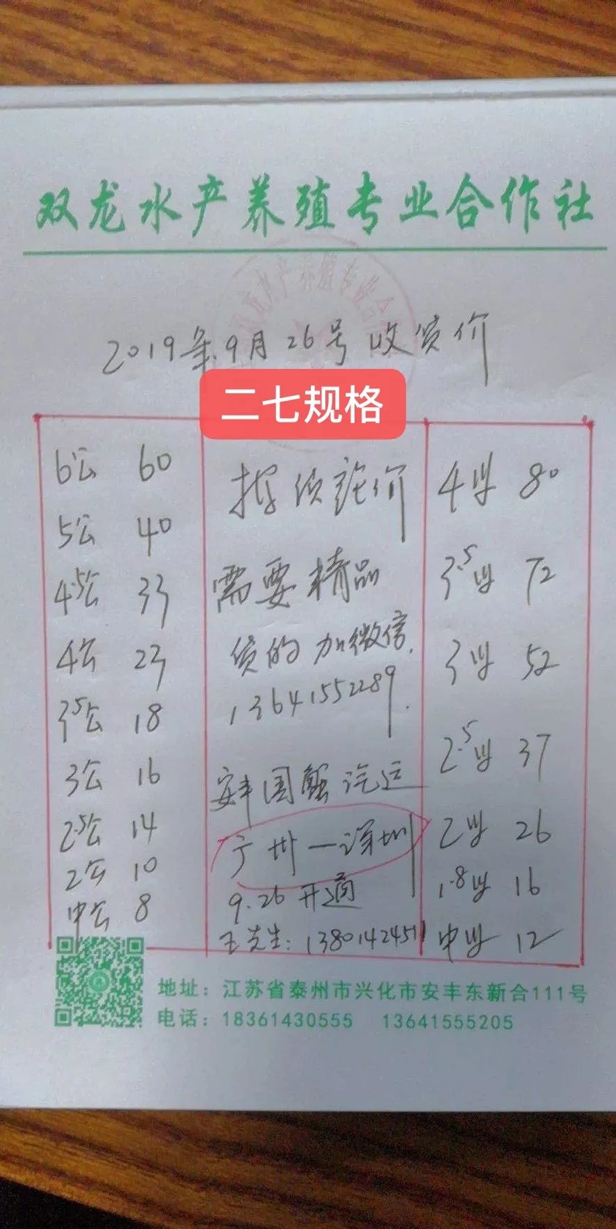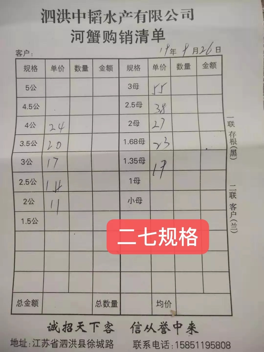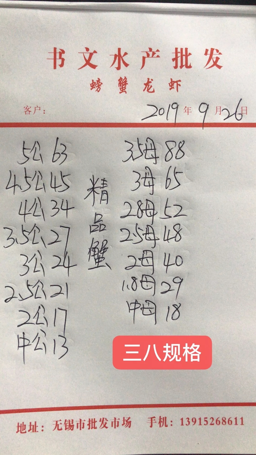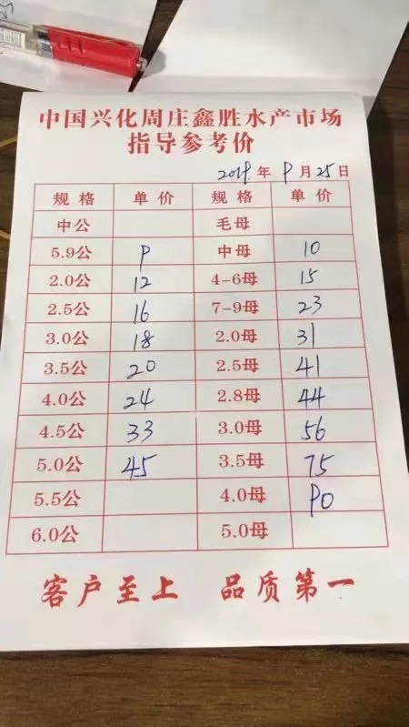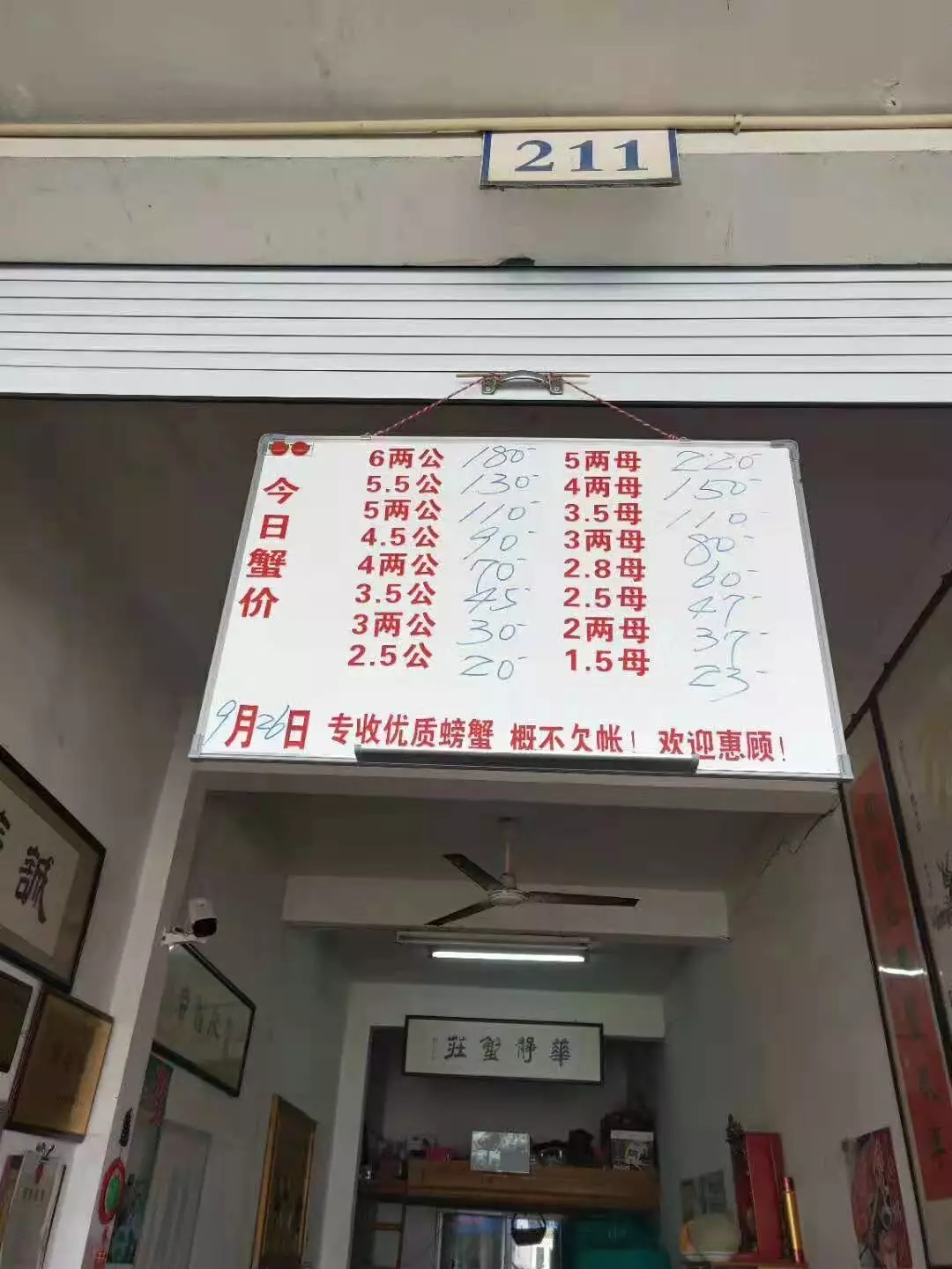 | 中國水產頻道報道, 做國內最中立的報價平臺,不被利益綁架,讓養殖者、流通商、零售商與消費者都能第一時間了解最真實的價格與供求數據。 行情分析 與昨天相比,興化今天蟹價基本平穩,僅2母下跌1元/斤,其他規格價格不變。 高淳今天公蟹上漲較多,5公從110元/斤漲至120元/斤,4.5公、4公、2公均上漲5元/斤;母蟹僅3.5母上漲10元/斤,2母漲1元斤;其他規格價格不變。 盤錦2母跌1元/斤,1公漲0.5元/斤,其他規格價格不變。 ——蝦蟹前沿 今日參考價 興化 此報價由興化丁老板提供 此報價由鹽城天邦申亞陽提供 高淳 此報價由江蘇好潤固城湖店劉坤提供 此報價由江蘇好潤獅樹店田玲提供 此報價由江蘇好潤固城湖店劉坤提供 盤錦 此報價由盤錦王老板提供 泗洪 此報價由泗洪孫老板提供 宣城 此報價由宣城劉老板提供 鹽城 此報價由鹽城天邦申亞陽提供 無錫 |