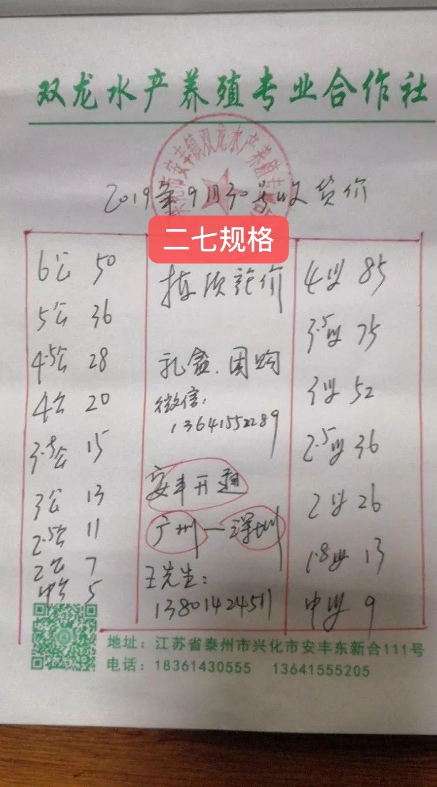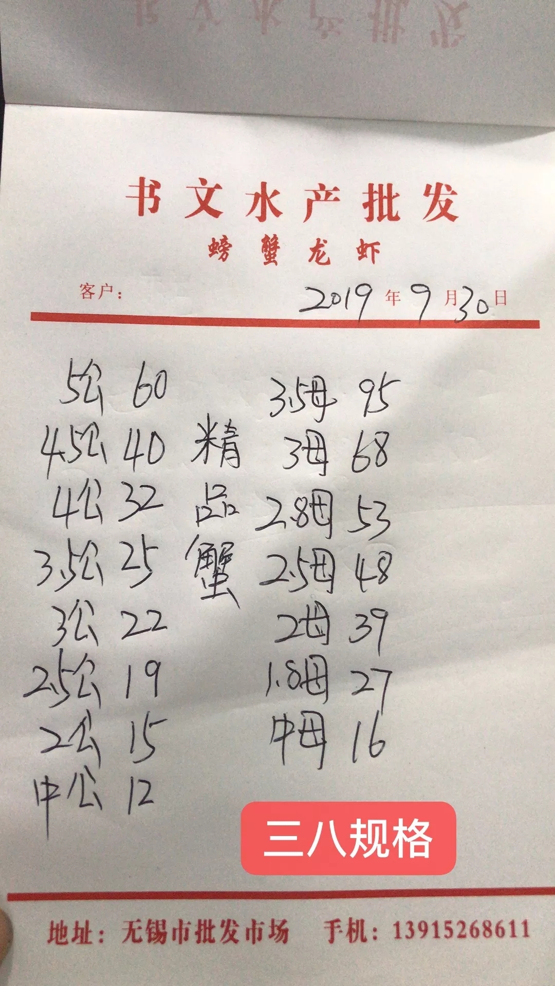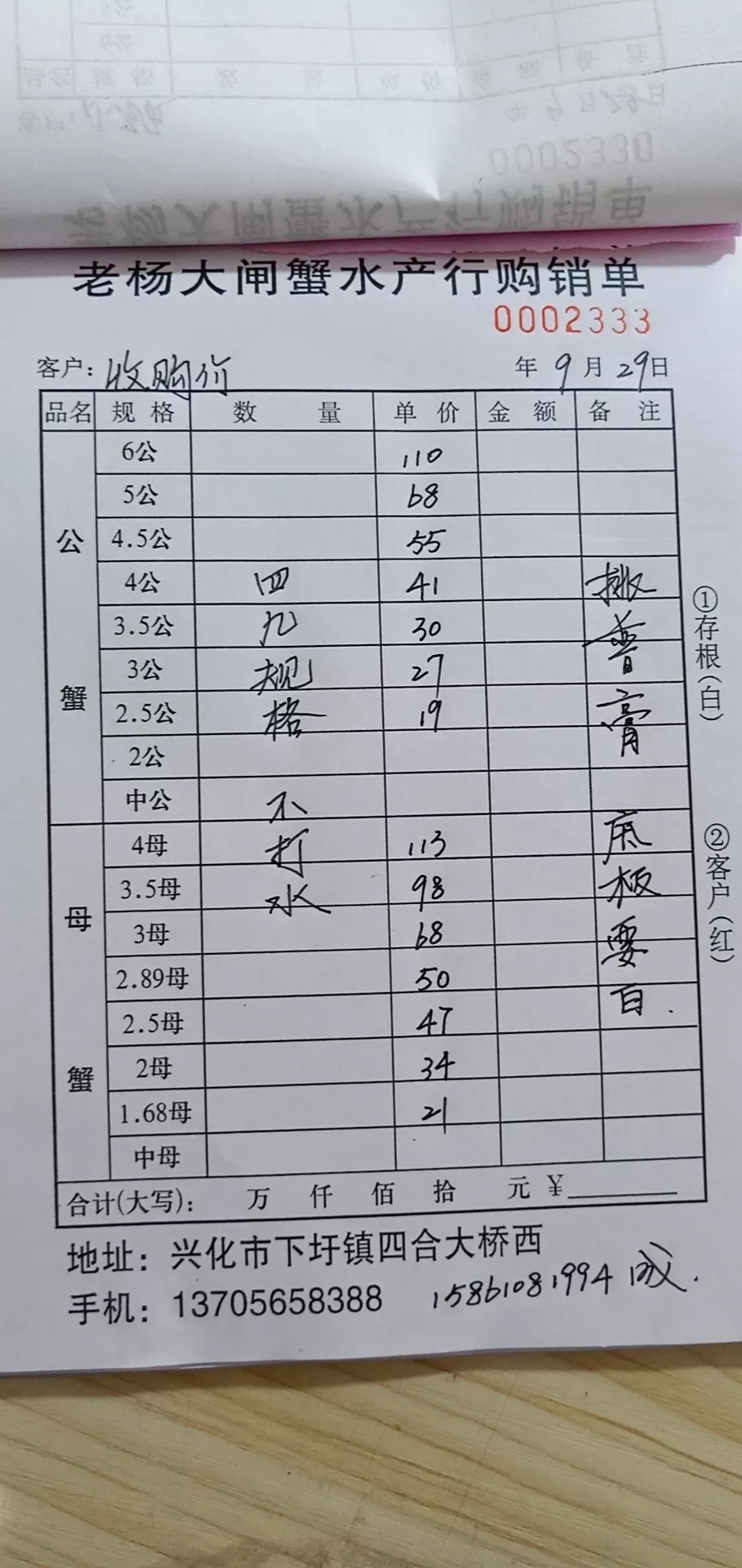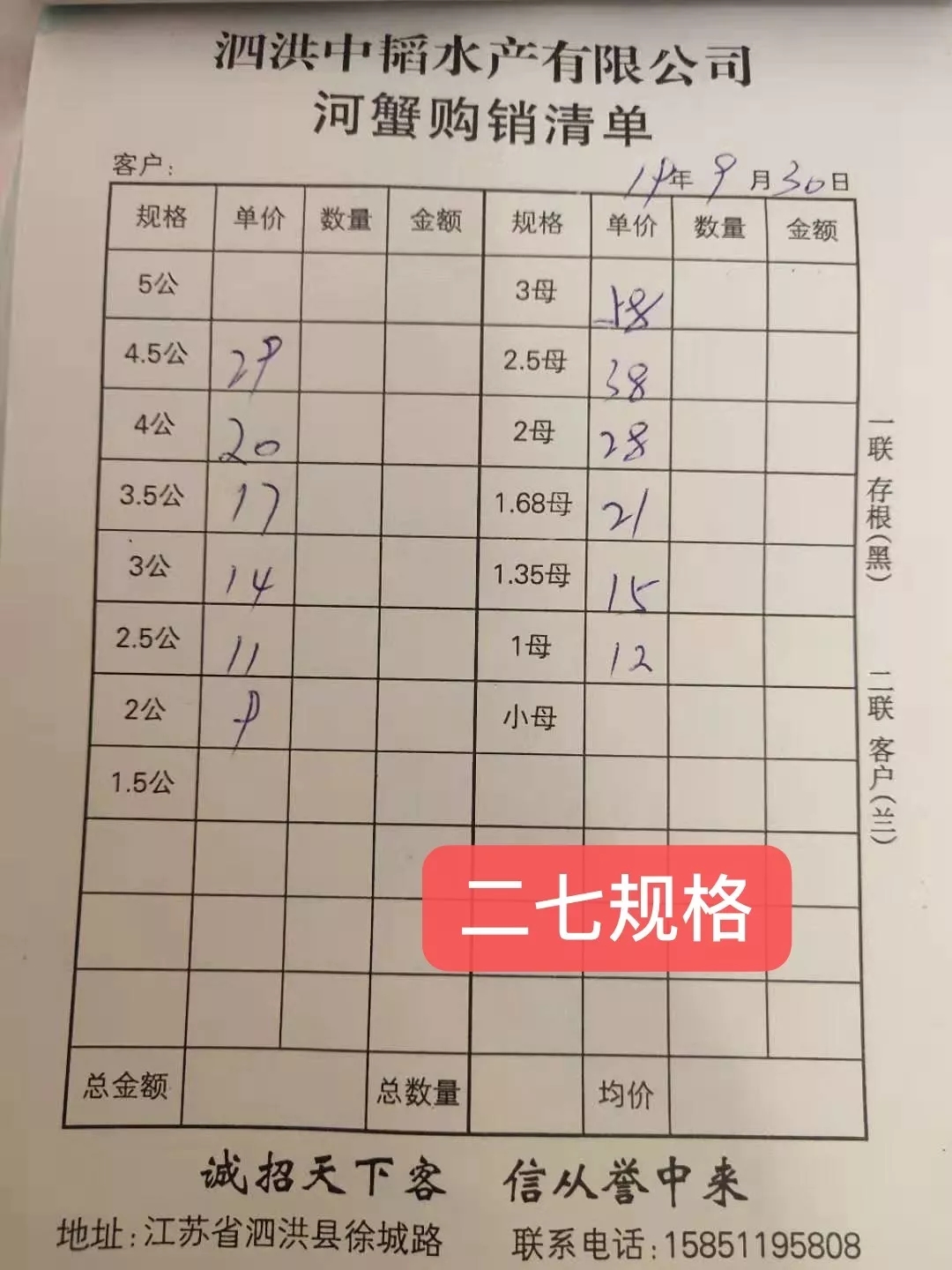 | 中國水產頻道原創報道, 最新行情解析 興化 本周興化蟹價整體走低,僅昨天稍有上漲,但今天基本跌回原樣。蟹價持續低迷,養殖戶叫苦連天。與去年同期相比,蟹價仍然偏低,今年河蟹養殖戶很有可能面臨豐產不豐收的尷尬局面。 今天興化整體下跌,僅2母、中母價格未變,其他規格均下跌1-5元/斤不等,6公從55元/斤跌至50元/斤,3母、3.5母、4母均跌3元/斤。 高淳 本周高淳蟹價漲跌起伏較大,今天跌幅最大。與去年同期相比,價格相差很大,去年3母達到105元/斤,今年只有85元/斤。 今天高淳精品門市中大規格蟹價下跌,部分規格價格未變,僅1.8兩母蟹上漲2元/斤。5公、4.5公、4母、3.5母均跌10元/斤,4公、3母跌5元/斤。 今日參考價 興化 此報價由興化丁老板提供 此報價由江蘇好潤永豐店提供 此報價由江蘇好潤下圩店張玉蘭提供 高淳 此報價由江蘇好潤固城湖店劉坤提供 此報價由江蘇好潤獅樹店田玲提供 此報價由江蘇好潤固城湖店劉坤提供 泗洪 此報價由泗洪孫老板提供 馬鞍山 此報價由江蘇好潤塘南店張悅提供 無錫 |