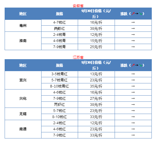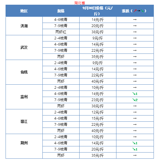 | 中國水產頻道報道, 最新行情解析 今天,云南和湖北多個地區小龍蝦價格再次出現下滑,其他地區批發價沒有出現明顯變化。其中,湖北荊州和監利地區4-6錢均下滑1元,最新報價14元/斤;監利地區7-9錢的蝦下滑2元,最新報價23元/斤;荊州地區7-9錢的下滑1元,報價20元/斤;云南地區整體下滑2元/斤,4-6錢最新報價18元/斤,7-9錢報價30元/斤,兩蝦賣37元/斤。據了解,目前各地區的實際價格甚至更低,部分地區中青甚至賣到11元/斤。往年這個時候蝦價一般都開始有明顯上漲,但今年的價格相比去年同期有明顯下滑。雖然國慶將至,但是蝦價行情卻還是未能看到上漲勢頭。有養殖戶表示,黃岡地區今年8月投的苗到現在只能賣到10-13元/斤,成本都收不會來,還不知道明年的行情會怎樣。為此,很多養殖戶對于明年的行情也表示很擔憂,未來小龍蝦行情將如何走勢,歡迎留言分享! 全國主要產地市場小龍蝦批發價 |