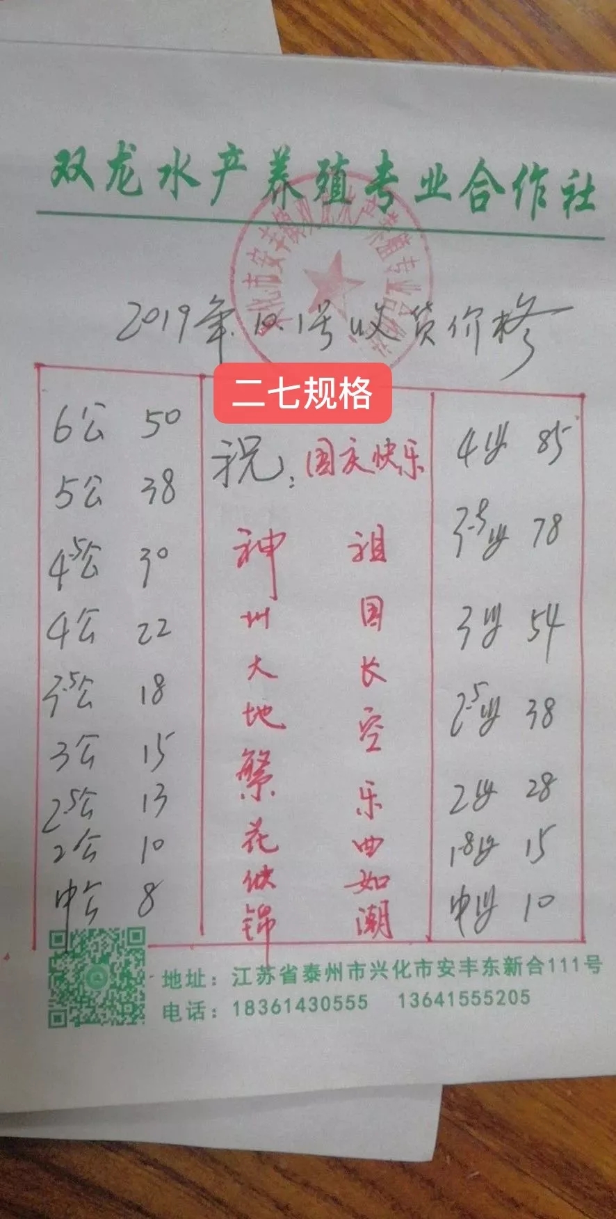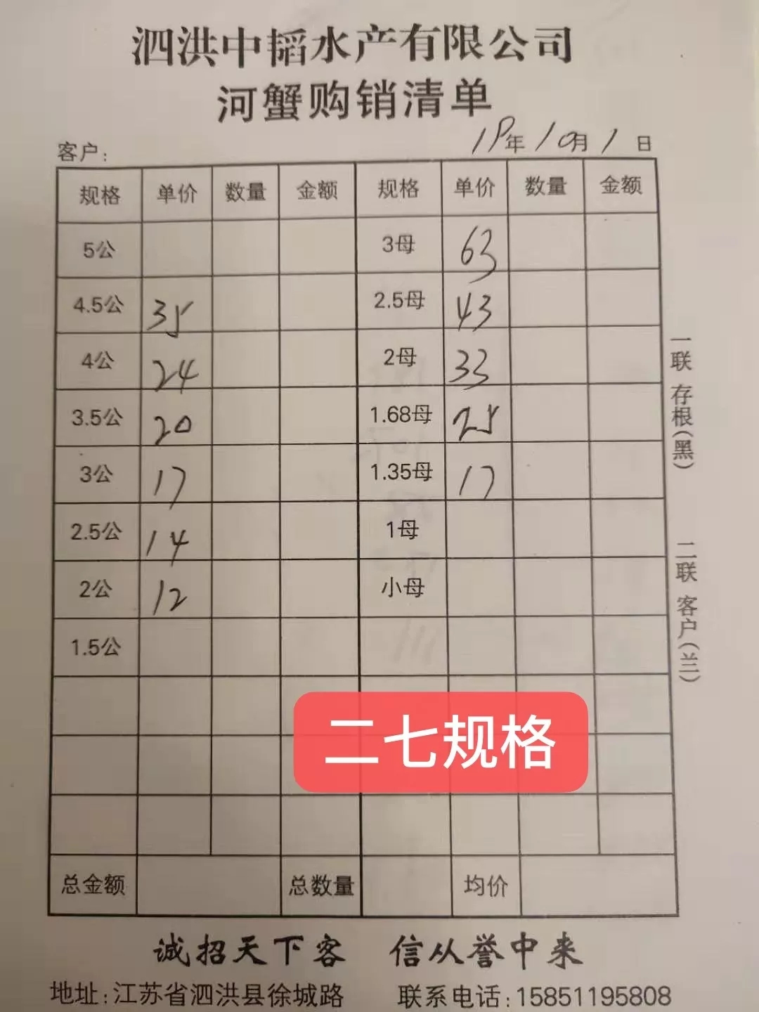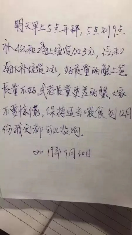 | 中國水產頻道原創報道, 最新行情解析 興化 近期興化蟹價不是很穩定,漲跌互現。繼昨天下跌后,今天迎來一波小幅度的上漲。即使如此,目前的蟹價仍然偏低,與去年相比,價格偏低10%左右。國慶假期,需求量較往常大,蟹價有望維持上漲勢頭。 今天興化除6公、4母蟹價沒有上漲,其他規格均有不同程度的上漲。2公、3.5公、中公上漲3元/斤,中母漲1元/斤,其他規格大多上漲2元/斤。 高淳 本周高淳蟹價起伏較大,昨天下跌后,今天蟹價呈暴漲態勢。但與去年相比,價格仍有一定差距,特別是母蟹,比去年低10-25元/斤。 今天高淳精品門市全線上漲,平均蟹價上漲7元/斤,3母、4.5公暴漲15元/斤,上漲幅度最大。2公、小母等規格也上漲2元/斤。 與此同時,高淳某門市發出公告,建議養殖戶理性看待今年河蟹行情,合理出貨。 高淳某門市公告 今日參考價 興化 此報價由興化丁老板提供 此報價由江蘇好潤永豐店提供 高淳 此報價由江蘇好潤固城湖店劉坤提供 此報價由江蘇好潤獅樹店田玲提供 此報價由江蘇好潤固城湖店劉坤提供 此報價由江蘇好潤固城湖店劉坤提供 泗洪 此報價由泗洪孫老板提供 此報價由江蘇好潤臨淮店賈明先提供 此報價由江蘇好潤臨淮店賈明先提供 馬鞍山 此報價由江蘇好潤塘南店張悅提供 無錫 此報價由江蘇無錫王老板提供 上海 |