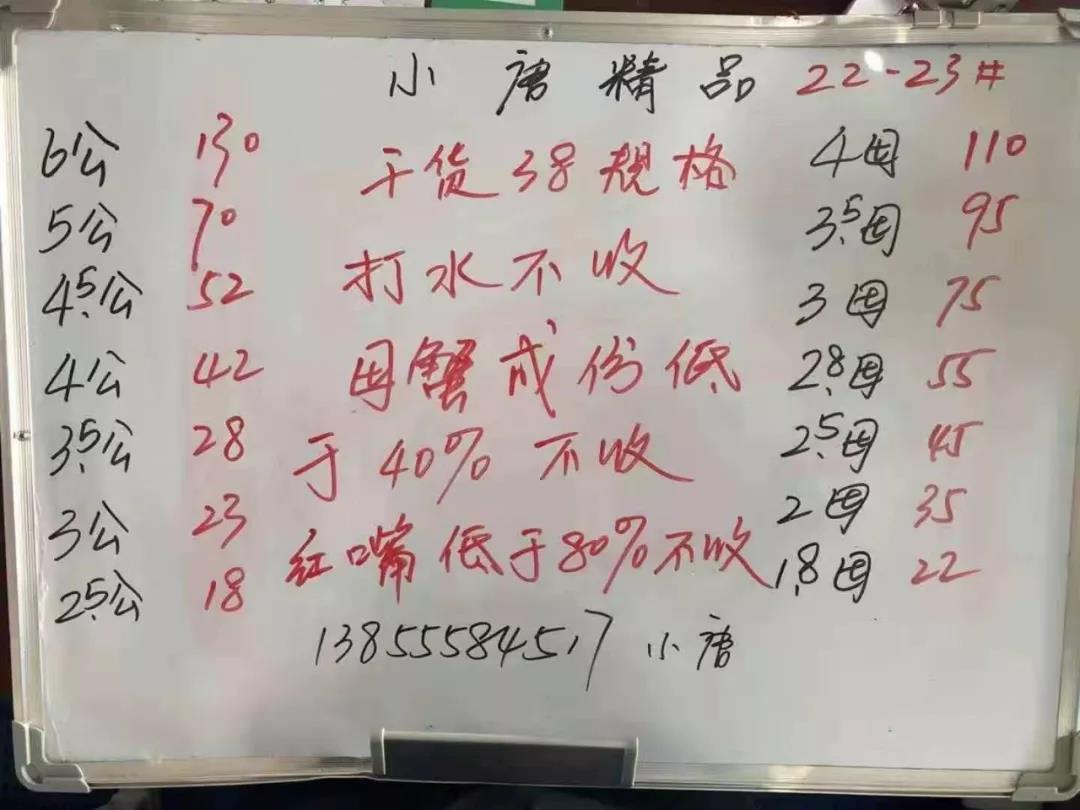 最新行情解析 興化 中國水產頻道原創報道,近期興化蟹價整體呈上漲趨勢,較國慶節前平均上漲2元/斤。但今天蟹價有所下跌,跌價主要以公蟹為主。目前市場對母蟹的需求還是比較大,母蟹價格堅挺,部分規格還略有上漲。蟹價主要還是由供需決定,公蟹成熟晚,目前需求少,價格暫時難以持續上漲。 今天興化公蟹除6公、中公外,其他規格下跌1-3元/斤不等。3.5公跌價最多,由20元/斤跌至17元/斤。母蟹大多平穩,2母、2.5母均上漲1元/斤。 高淳 近期高淳蟹價起伏較大,繼昨天小漲后,今天呈斷崖式下跌,價格甚至低于國慶節前,且低于去年同期。 今天高淳精品門市全線下跌,大蟹大跌,小蟹小跌。4.5公、5公、6公暴跌20元/斤,2.5母及以上規格均跌10元/斤以上。小規格蟹跌2-5元不等。 今日參考價 興化 此報價由興化丁老板提供 此報價由江蘇好潤永豐店提供 高淳 此報價由江蘇好潤固城湖店劉坤提供 此報價由江蘇好潤獅樹店田玲提供 此報價由江蘇好潤獅樹店田玲提供 盤錦 此報價由盤錦王老板提供 泗洪 此報價由江蘇好潤臨淮店賈明先提供 此報價由江蘇好潤臨淮店賈明先提供 馬鞍山 此報價由江蘇好潤塘南店張悅提供 無錫 此報價由江蘇無錫王老板提供 宣城 此報價由宣城劉老板提供 |