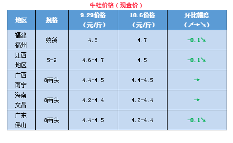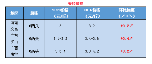| 中國水產頻道原創報道, 本周牛蛙、泰蛙最新行情報價 文/ 水產前沿 陳曉慶 一周行情簡析 牛蛙 十一節假日期間牛蛙行情較為平穩,部分地區價格略微下跌。今日福建福州牛蛙現金價4.7元/斤,欠賬5.2元/斤,相比上周下降了0.1元/斤;福建廈門5-9規格4.6元/斤,4-8規格4.4元/斤。江西5-9規格收4.5元/斤,相比上周下降了0.1元/斤;廣東佛山8兩頭牛蛙報價4.2-4.4元/斤,相比上周下降了0.1-0.2元/斤;廣西南寧、海南文昌8兩頭牛蛙分別報價4.4-4.5、4.2-4.4元/斤,與上周持平。 牛蛙存欄過多,小長假期間市場消費的增大也沒能拉動價格的上漲。牛蛙市場消費大部分來自餐飲而非日常家庭,目前“吃蟹正當時”,有業內人士認為,現在大閘蟹的火熱也給牛蛙消費帶來了一定的沖擊。大部分養殖戶將希望寄托在中秋和黃金周兩個節假日,然而都沒有漲上來,而澄海的牛蛙還有一個多月就要上市(農歷十月份前后),存欄的蛙剩下的機會顯然已經不多了。 泰國虎紋蛙 節假日期間泰蛙行情終于止跌,迎來了全面的上漲。海南文昌6兩頭今日報價3.2元/斤,相比上周上漲了0.2元/斤,廣東佛山6兩頭報價3.4-3.6元/斤,相比上周上漲了0.4元/斤,上漲幅度最大,廣西南寧6兩頭報價3.8-4.2元/斤,相比上周上漲了0.2元/斤,價格最高。 小長假期間市場消費需求量增大,拉動了泰蛙價格的上漲。經過了近一段時間來的市場消耗,中批蛙、大蛙的存欄量有所減少,后期市場行情還有上漲的趨勢。 |