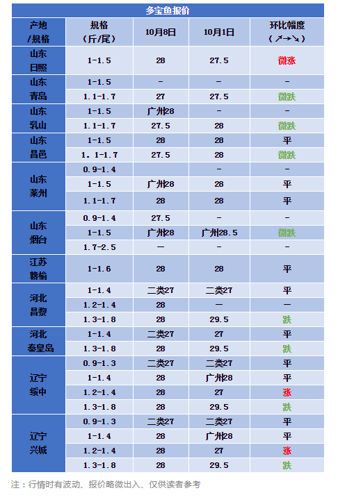 | 中國水產(chǎn)頻道原創(chuàng)報道, 文 | 表 工業(yè)化水產(chǎn)圈 植銀素 本周行情 黃金周假期多種魚集中上市,草魚、鯽魚、鯉魚、鳊魚、黃顙魚、鮰魚、加州鱸等淡水魚行情出現(xiàn)下滑的趨勢,而海水魚價格較為平穩(wěn),海鱸價格一路高漲,多寶魚也不示弱,在假期間魚價接近30元/斤! 本周部分地區(qū)多寶魚價格出現(xiàn)節(jié)后回落,幅度在0.5-1元之間,但整體保持穩(wěn)定。流通商表示今年十一假期多寶魚的漲勢不算太猛,因此節(jié)后掉價也在預(yù)想之內(nèi),但是對比去年同期價格高出3-4元,還是讓養(yǎng)殖戶感到振奮。近期多寶魚的需求減少,銷量下降,預(yù)計后期多寶魚價格還會維穩(wěn)一段時間。不過,在9月底時超標(biāo)魚存塘量較少,供應(yīng)出現(xiàn)缺口,后期超標(biāo)魚價格有望逐漸攀升。 10月后水溫開始逐漸下降,每年10-11月是大菱鲆腸炎腹水高發(fā)期,建議廣大養(yǎng)殖戶朋友提前做好換季疾病預(yù)防措施,減少使用冰鮮雜魚投喂,降低養(yǎng)殖風(fēng)險。 希望所有的多寶魚養(yǎng)殖戶加強(qiáng)溝通,讓信息更通暢一些,每個人都能賣出高價,好價! |