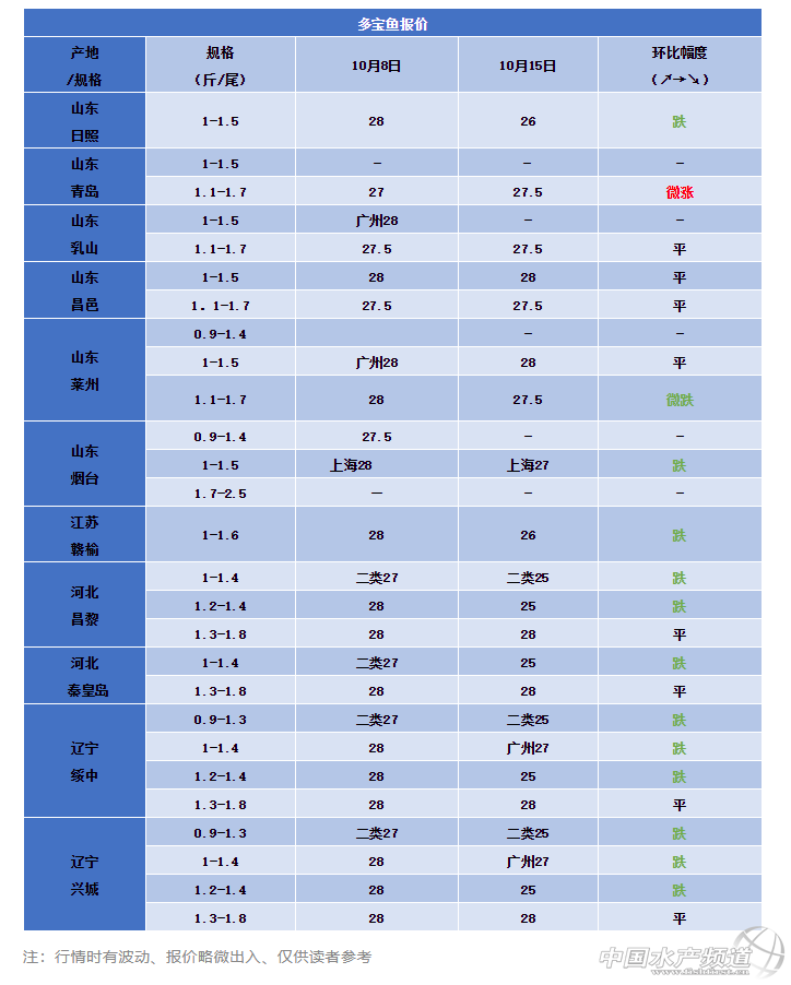 | 中國水產頻道原創報道, 農業用水改革,將會產生什么影響,魚價會漲嗎? 文 | 表 工業化水產圈 張河長 本周價格 本周行情 昨天在冷空氣的影響下,北方大部地區氣溫低迷,東北、華北等多地氣溫創下了今年下半年來新低。隨著冷空氣繼續南下,今天開始,南方也將開啟降溫模式,今明天,西南地區雨水仍較頻繁,當地需防范強降雨產生的不利影響。 今天起,東北、華北氣溫將開始回升。東北回溫速度快,幅度大,今天之后最高氣溫將回升至15℃以上;華北中南部的回溫相對慢一些,京津冀等地要到19日前后最高氣溫才能重回20℃。 隨著冷空氣向南推進,今天黃淮、江淮、江漢、江南北部等地以及新疆、青海等地的部分地區降溫仍將持續。其中,河南西北部、湖北西北部等地不僅降溫幅度較大,多地還有大風相伴。 本周部分地區多寶魚價格維穩,但部分地區魚價回落0.5-3元之間。流通商表示現市場不穩定,行情不太理想,不過現在存塘量較少,部分地區出現供應缺口,預計后期會有漲價空間。今日魚苗報價約1元/尾。現寒露已過,霜降將至,已進入降溫季節,需提前做好換季疾病預防工作。 此外部分地區在不同程度的部署、開展農業用水改革計劃,例如近期海安市老壩港濱海新區、蘇州市吳江區、湖南郴州市、山東菏澤市、湖北京山市等。國家和部分政府已經制定了農業用水的改革方針,部分地區的推行力度不同,但只是遲早的問題,以煤改為例。為此養殖戶和企業需要多留意相關政策。 |