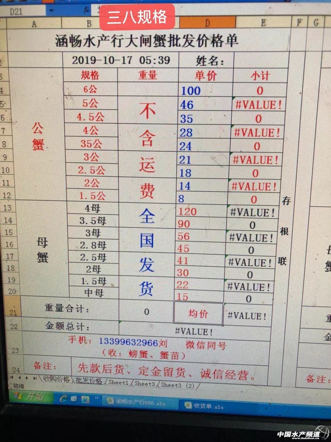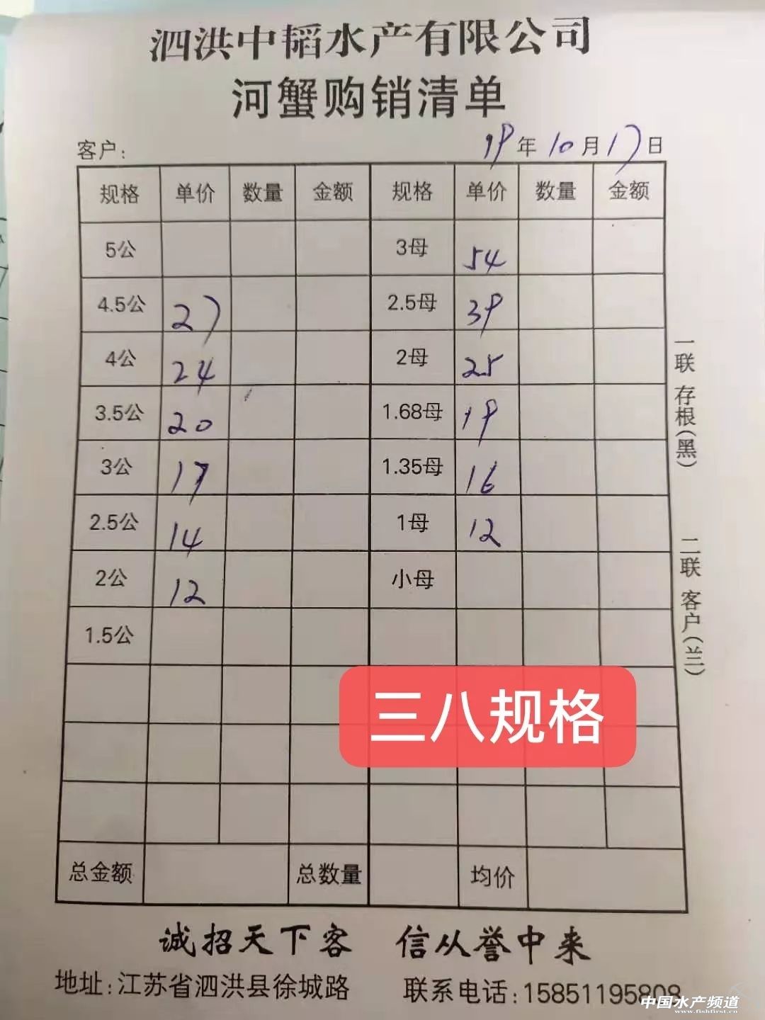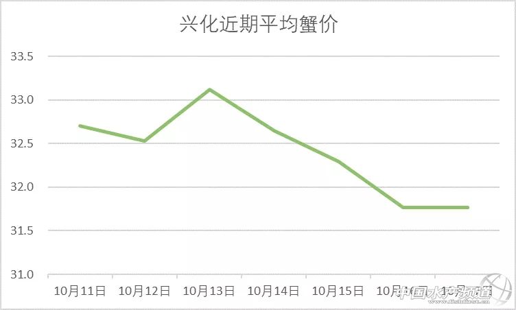 | 中國水產頻道原創報道, 目前行情低迷,價格變化不大。 蝦蟹行情每日播報 您身邊的行情顧問 歡迎關注蝦蟹前沿公眾號! 最新行情解析 興化 自10月13日平均蟹價突破33元/斤后,近期興化蟹價持續走低,今天蟹價與昨天持平,同為近期最低。與去年同期相比,蟹價整體偏低。 今天興化5公跌1元/斤,1.8母漲1元/斤,其他規格蟹價未變。 高淳 近期高淳蟹價波動略為明顯,但價差不是很大,涉及的規格也不是很多。今天高淳平均蟹價較昨天下跌0.7元/斤,平均蟹價仍保持在60元/斤以上。與去年同期相比,目前蟹價明顯偏低。 今天高淳精品門市6公從昨天的160元/斤又跌回150元/斤,1.8母跌1元/斤,其他規格蟹價未變。 今日參考價 興化 此報價由興化丁老板提供 高淳 此報價由江蘇好潤固城湖店劉坤提供 泗洪 此報價由泗洪孫老板提供 無錫 此報價由無錫王老板提供 宣城 |