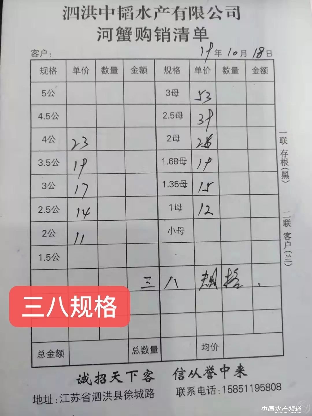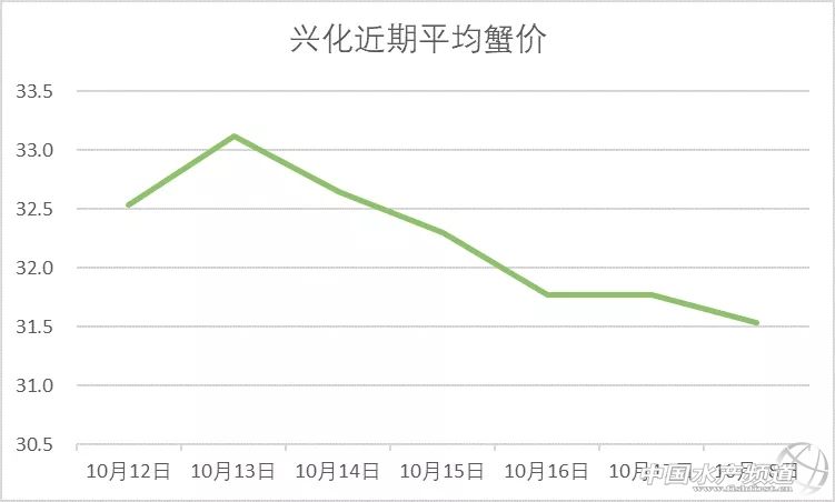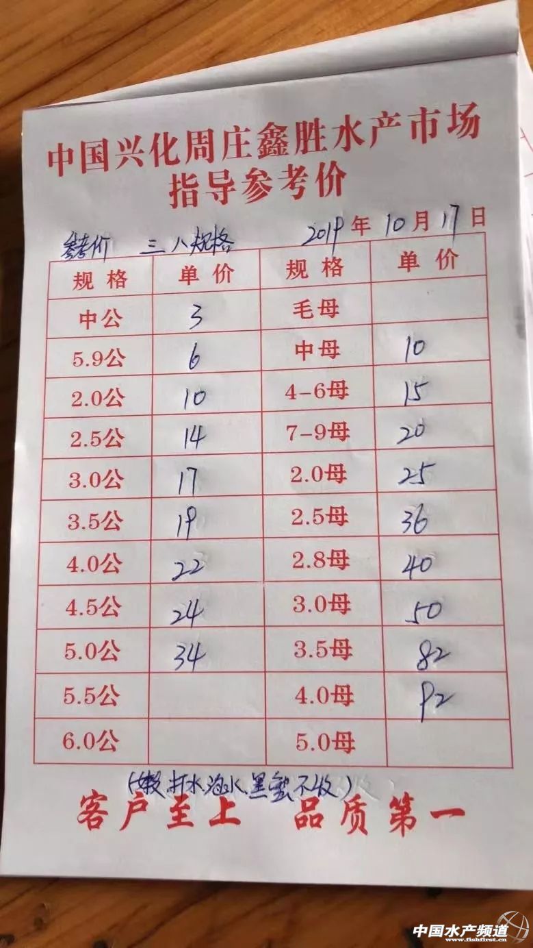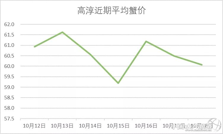 | 中國水產頻道原創報道, 興化公蟹下跌,高淳整體微跌。 蝦蟹行情每日播報 您身邊的行情顧問 歡迎關注蝦蟹前沿公眾號! 最新行情解析 興化 自10月13日上漲后,近期興化蟹價持續走低,目前平均蟹價為31.5元/斤。今天較昨天繼續下跌,但跌幅很小。與去年相比,目前蟹價整體偏低。 目前興化公蟹跌價較多,5公、2.5公、2公、中公均跌1元/斤。母蟹價格未變。 高淳 近期高淳蟹價略有起伏,今天整體略微下跌,平均蟹價60.1元/斤。與去年同期相比,目前高淳蟹價明顯偏低。 今天高淳精品門市4公漲2元/斤,3.5公漲1元/斤,4母跌10元/斤,其他規格價格未變。 今日參考價 興化 此報價由興化丁老板提供 此報價由鹽城天邦申亞陽提供 高淳 此報價由江蘇好潤固城湖店劉坤提供 此報價由鹽城天邦申亞陽提供 泗洪 此報價由泗洪孫老板提供 無錫 此報價由無錫王老板提供 宣城 此報價由宣城劉老板提供 馬鞍山 |