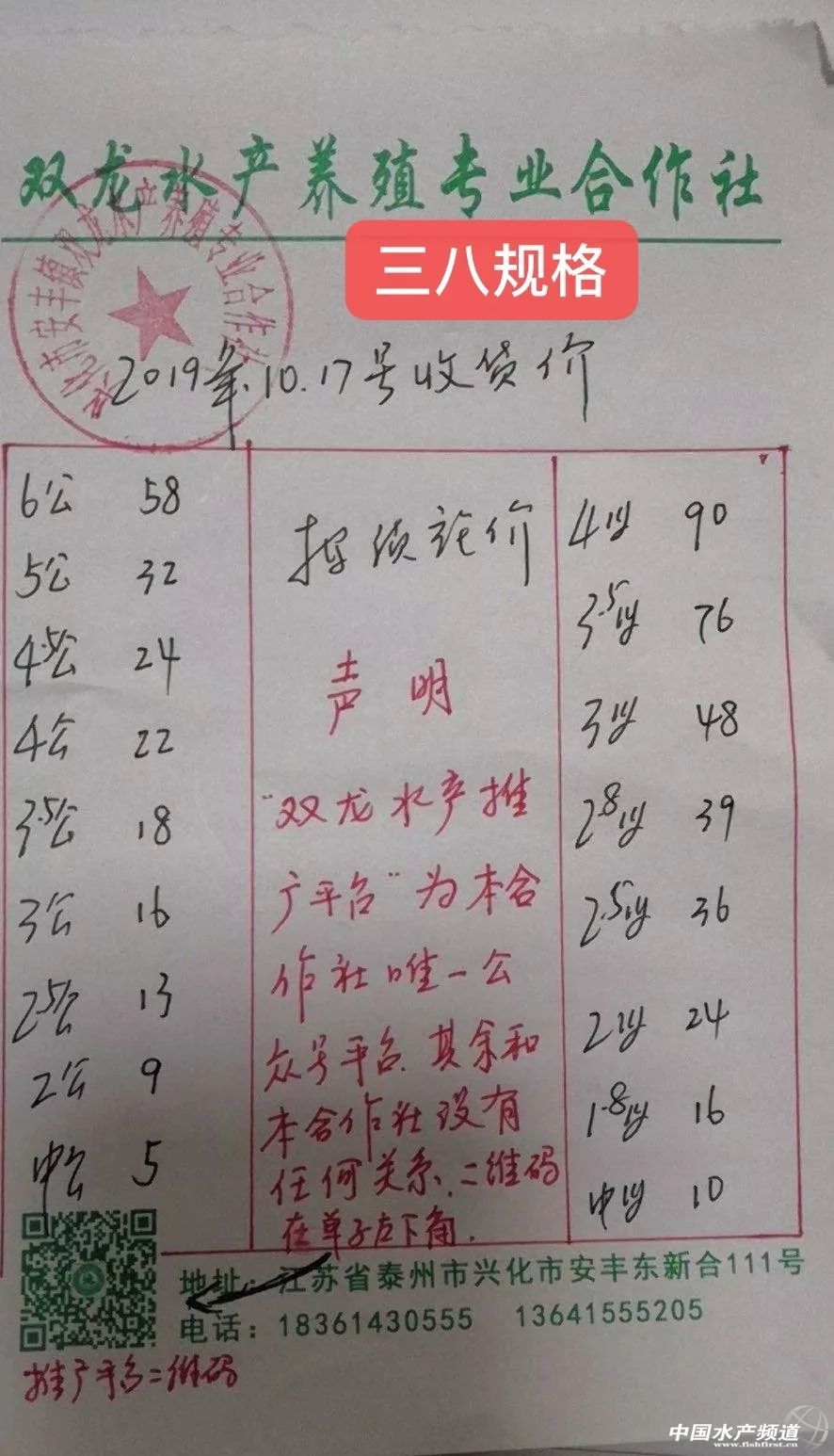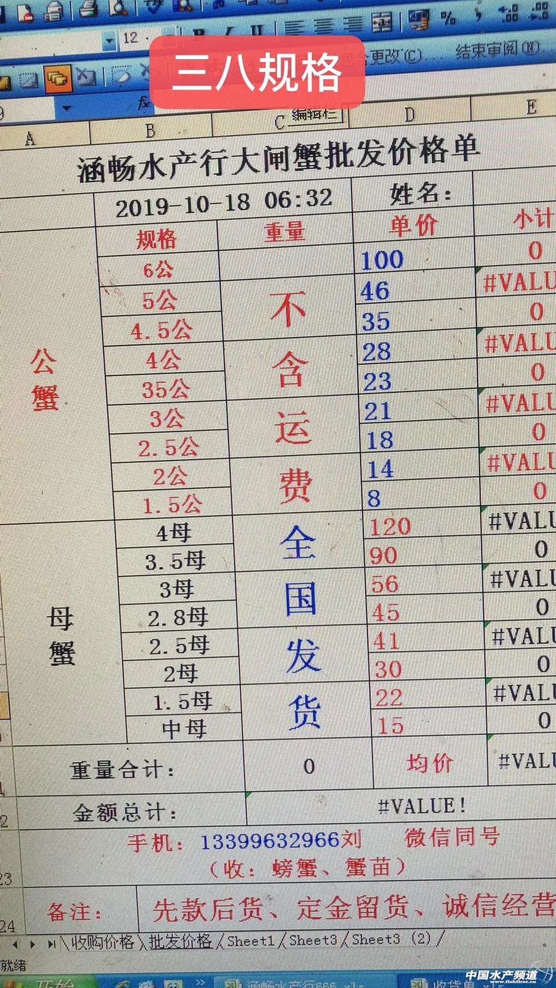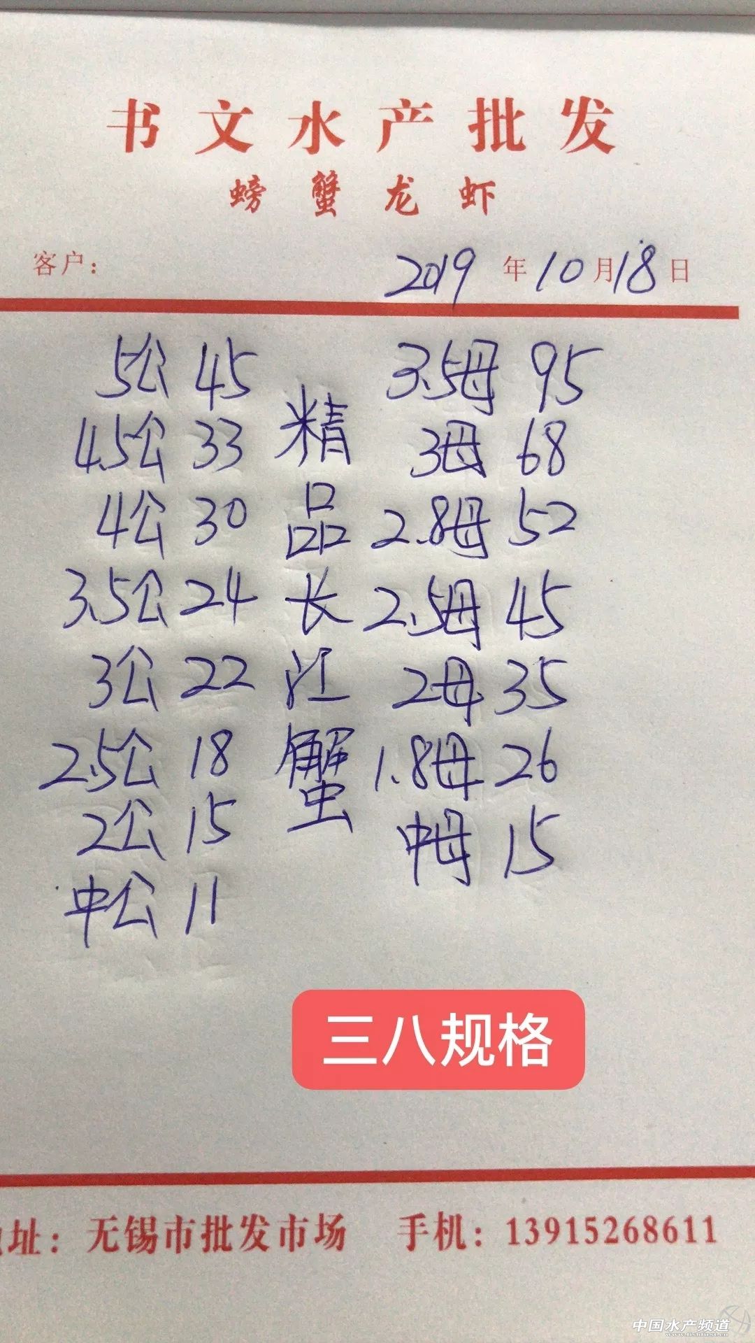 | 中國水產頻道原創報道, 興化公蟹下跌,高淳整體微跌。 蝦蟹行情每日播報 您身邊的行情顧問 歡迎關注蝦蟹前沿公眾號! 最新行情解析 興化 自10月13日上漲后,近期興化蟹價持續走低,目前平均蟹價為31.5元/斤。今天較昨天繼續下跌,但跌幅很小。與去年相比,目前蟹價整體偏低。 目前興化公蟹跌價較多,5公、2.5公、2公、中公均跌1元/斤。母蟹價格未變。 高淳 近期高淳蟹價略有起伏,今天整體略微下跌,平均蟹價60.1元/斤。與去年同期相比,目前高淳蟹價明顯偏低。 今天高淳精品門市4公漲2元/斤,3.5公漲1元/斤,4母跌10元/斤,其他規格價格未變。 今日參考價 興化 此報價由興化丁老板提供 此報價由鹽城天邦申亞陽提供 高淳 此報價由江蘇好潤固城湖店劉坤提供 此報價由鹽城天邦申亞陽提供 泗洪 此報價由泗洪孫老板提供 無錫 此報價由無錫王老板提供 宣城 此報價由宣城劉老板提供 馬鞍山 |