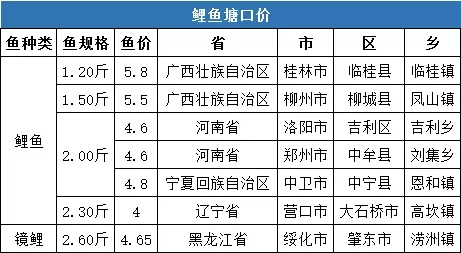 | 中國水產頻道報道, 鯉魚 數據分析:本周全國鯉魚塘口均價4.85元/斤,同比上漲4.08%,環比下跌2.81%。 華北地區:本周河南、遼寧地區養殖戶同比去年出魚積極性較高,但近期市場消費疲軟,市場流通量環比上周有輕微減少,價格與上周持平。黑龍江地區鏡鯉存塘逐漸減少,價格較上周上浮0.05元/斤。 華西地區:寧夏地區養殖戶出魚高峰期已過,九月中下旬鯉魚流通量明顯減弱,部分地區價格售4.6元/斤,流通量與上周持平,價格與上周持平。四川樂山地區價格較上周持平。 |