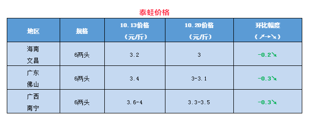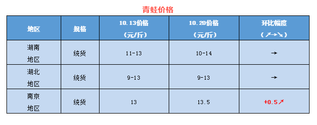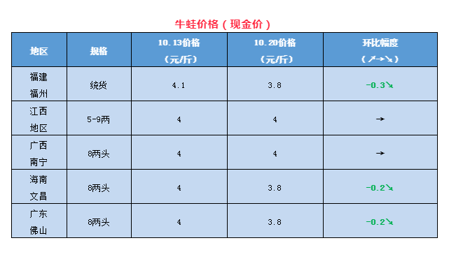 | 中國水產頻道原創報道, 本周牛蛙、泰蛙最新行情報價 文/ 水產前沿 陳曉慶 一周行情簡析 牛蛙 本周牛蛙價格繼續下滑。福建福州今日牛蛙現金價3.8元/斤,欠賬4.3元/斤,相比上周下降了0.3元/斤。江西地區5-9兩規格的牛蛙報價3.6元/斤,廣西南寧8兩頭牛蛙報價4元/斤,價格穩定。海南文昌、廣東佛山8兩頭牛蛙報價3.8元/斤,相比上周下降了0.2元/斤。 牛蛙的養殖成本在4元/斤左右,現在的價格早已跌破了成本價,養殖戶多數不愿意出蛙,留塘等蛙價好了再賣,然而也有的養殖戶為了降低密度和清理病蛙不得不虧本出售。 而本周末牛蛙價格卻傳來了上漲的喜訊。周五、周六不斷傳出牛蛙漲價的消息,但各個地區價格混亂,難以統計。昨日大蛙3.8元/斤依然有人在收。今日有流通商福建南平、三明等地5-9的大蛙報價4.2元/斤,每個級別下降兩毛,江西地區大蛙報價4元/斤,據福建某流通商稱,目前市場上的蛙依然很多,此處提價一定程度上也是為了刺激養殖戶出蛙。 今年年底的低價對于新進的養殖戶來說是一個巨大的考驗,行情的低迷也讓許多小規模的散戶對于明年的養殖望而卻步,相對來說,三四十畝以上的養殖大戶卻越來越多。 泰國虎紋蛙 本周泰蛙價格繼續小幅下滑。海南文昌6兩頭已跌到3元/斤,廣東佛山6兩頭報價3-3.1元/斤,廣西南寧6兩頭報價3.3-3.5元/斤,相比上周下降了0.2-0.3元/斤。 牛蛙與泰蛙可謂難兄難弟,低迷的行情也讓養殖戶承受著巨大的壓力。現在這個時候養殖戶都在準備投放越冬苗,為了好有空欄下苗,也只能虧本賣蛙。 青蛙(黑斑蛙) 本周各地青蛙價格平穩,南京地區周末青蛙價格小幅增長,上漲了0.5元/斤。 |