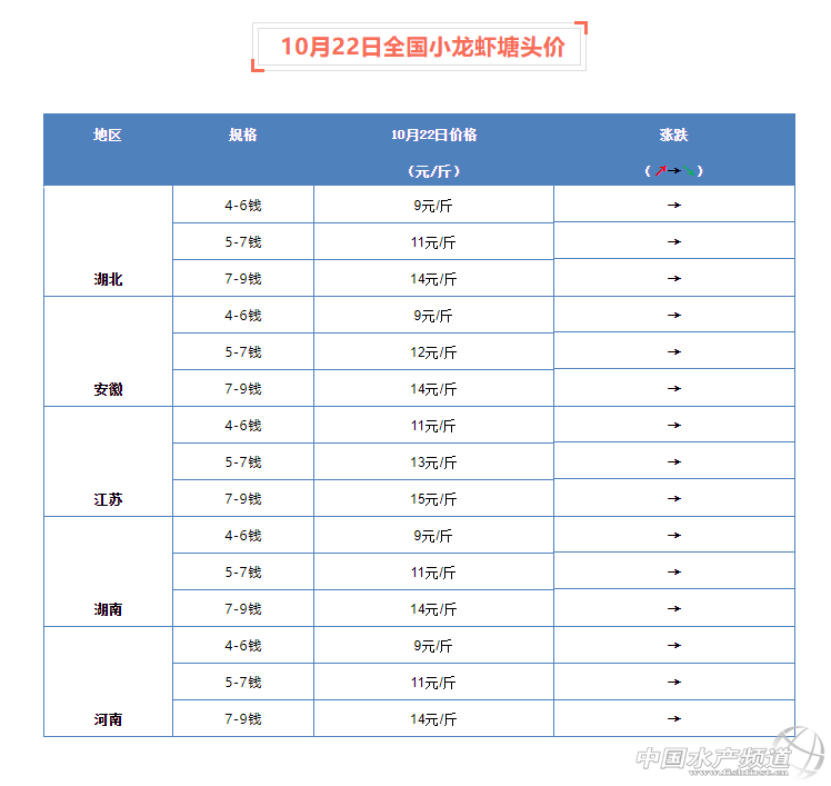 摘要: 中國水產頻道原創報道,10月22日全國小龍蝦塘頭價 。