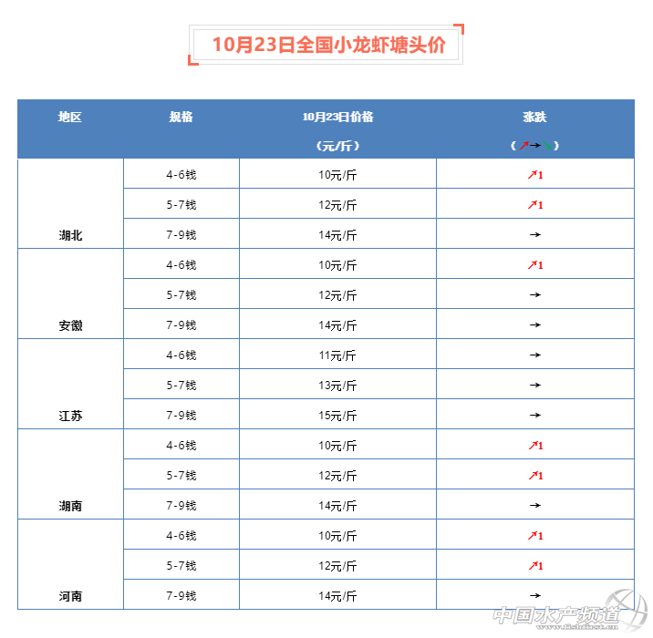 摘要: 中國(guó)水產(chǎn)頻道原創(chuàng)報(bào)道,10月23日全國(guó)小龍蝦塘頭價(jià)。