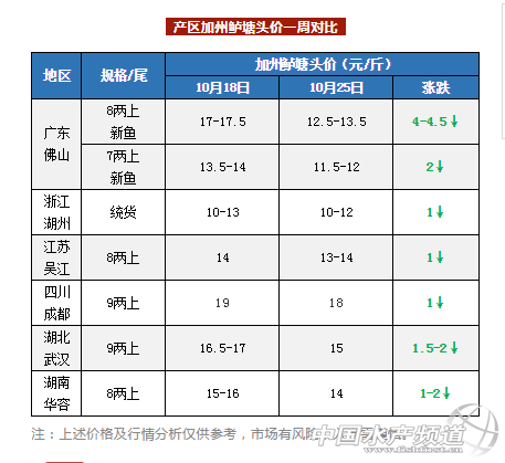 中國水產頻道原創報道, 養好魚,更要賣好魚! 加州鱸行情周報 《鱖鱸前沿》與您相約每周五 文/圖 鱖鱸前沿 李曉欣 本周,產區加州鱸塘頭價全線下跌,跌幅達1-4.5元/斤不等。一方面,本周廣東、浙江、江蘇、四川新魚持續加大上市,而其他省區新魚也開始陸續上市;另一方面,近期部分地區加州鱸魚塘暴發潰瘍、爛身、諾卡氏菌等病害,病魚上市對市場也有所沖擊,導致魚價行情持續回落。 圖片來源于熱心網友 關于加州鱸諾卡氏菌病的防治,可點擊往期文章回顧:加州鱸諾卡氏菌瘋狂來襲!實戰派分享診斷、防治方法,建議收藏! 業者預計,隨著新魚上市量不斷加大,塘頭價將逐步回落,建議養殖戶理性看待魚價走勢,同時做好魚塘管理和病害防治措施,根據自身的養殖節奏合理選擇出魚時機,確保養殖收益。 廣東佛山 今天佛山新魚7兩上報價11.5-12元/斤左右,比上周價格跌了2元/斤;8兩上報價12.5-13.5元/斤左右,比上周下跌了4-4.5元/斤左右,二者價差縮小,實際定價看魚頭大小和規格比例略有浮動。 本周新魚上市量繼續加大,加上部分塘口暴發爛身、諾卡氏菌等病,病魚上市沖擊市場,致使魚價下滑。現在市場以出7兩上規格為主,魚中挑魚要求比較嚴格。 浙江湖州 今天湖州統貨報價10-12元/斤左右,相比上周價格下跌了1元/斤,具體定價看炮頭大小及8兩上規格成次。本周湖州新口鱸魚上市有所增多,加上廣東魚價下跌影響,當地魚價也有所回落。 江蘇吳江 今天吳江8兩上報13-14元/斤,比上周價格下跌了1元/斤,根據炮頭大小魚價略有浮動。本周吳江新魚出魚量有所增加,但大規格魚依然緊俏。 四川成都 今天成都9兩上報價18元/斤,相比上周價格下跌了1元/斤,主要是廣東魚價沖擊。成都養戶出魚較為積極,流通商多在本地收魚。 湖北武漢 武漢鱸魚9兩上報價15元/斤左右,一周下跌了1.5-2元/斤,主要是受廣東和江浙新魚上市增多影響。武漢本地新魚上市量還不大,市場以廣東和浙江魚為主。 湖南華容 華容8兩上鱸魚報價14元/斤左右,相比上周價格下跌了1-2元/斤,當地有少量新魚開始上市,受廣東魚價下跌影響,本地魚價有所回落。 【關鍵字】: 加州鱸 價格行情 水產養殖 |
