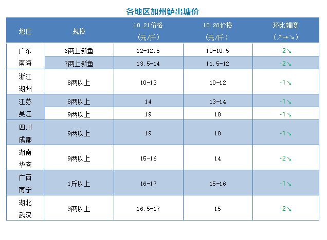 | 中國水產頻道原創報道, 文/圖 何氏水產、水產前沿 李靜 加州鱸 本周全國鱸魚價格全線下跌,跌幅在1-3元/斤不等,特別是廣東南海地區下跌幅度最大,達到3元/斤,其他產區也下跌了1-2元/斤。 1、現在廣東鱸魚新魚出魚量持續加大,本周大魚頭比例增多,新魚魚頭1.5斤的數量比上周多了,還是以出7兩以上與8兩以上的魚為主,6兩以上的魚相對比較少。本周新魚8兩上開塘價只要12元/斤左右,6兩和7兩以上價格都比上周下跌了2元/斤,6兩以上價格是10-10.5元/斤,7兩以上價格在11.5-12元/斤,魚頭越大價格越高。現在新魚成交價還是比較亂,主要看魚頭來定價。接下來價格可能還會有小幅下跌。 2、浙江湖州鱸魚新魚陸續上市,價格比上周持續下跌了1元/斤,8兩以上價格只有10-12元/斤,本周銷量有所增多,加上廣東魚價下跌影響,當地魚價有所回落。今天吳江8兩上報價13-14元/斤,比上周下跌了1元/斤,本周出魚量增加,大小魚價有所浮動。四川成都鱸魚新魚也在大量出魚,價格也比上周下跌了1元/斤。湖南華容、湖北武漢、廣西南寧本周價格也比上周下跌了1-3元/斤,主要是目前當地新魚大量上市,但銷量不大,所以價格持續下跌。 |