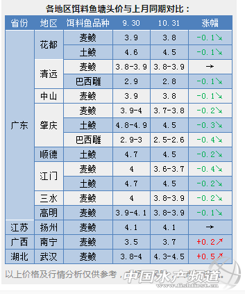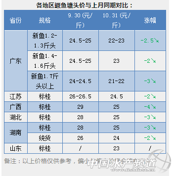 中國水產頻道原創報道, 虧到痛,虧到哭,大幅爛市!10月是崩盤的黑色月?11月魚價會雄起嗎? 文/圖 水產前沿 10月份剛剛過去,回顧17個熱點品種的魚蝦價格,漲少跌多。對蝦在月底才出現漲價,其余的只有鯽魚、甲魚等小幅上漲,但跌價的品種太多,且多為大幅下跌,尤其是鱖魚,與今年最高價相比,竟然暴漲了37元/斤,還有加州鱸、黃顙魚、生魚、海鱸、石斑魚呈現斷崖式下跌,養殖戶又要虧到心痛...... 10月份漲價的品種: 鯽魚、南美白對蝦、甲魚、小龍蝦 鯽魚:消費拉動,價格略升 江蘇鹽城地區鯽魚成魚0.5-0.6斤規格的5元/斤,0.7斤規格的5.6元/斤,0.8斤的6.5元,0.9斤規格的6.8元,1斤以上規格鯽魚8.5元/斤;華南地區中山8兩鯽魚8元/斤,廣州8兩鯽魚6.5元/斤,1斤規格鯽魚9元,南北區域鯽魚價格兩極分化;本月華東地區病魚持續沖擊市場,價格上表現疲軟跌幅明顯;加上鯽魚消費需求依然不旺,鯽魚行情出現持續性下調。江蘇泰州鯽魚0.5斤規格的5元/斤,0.6斤的5.5元/斤,0.7斤規格鯽魚6.1元,0.8斤規格的7.1元,0.9斤規格的7.5元;湖北地區小規格鯽魚價格整體下調,其中荊州0.5斤規格報價5.0元/斤,仙桃地區0.6斤規格報價4.5元/斤,武漢地區0.3-0.5斤規格報價5.1元/斤,0.7斤規格報價6.7元/斤,洪湖0.5斤規格報價4.4元/斤。 目前江蘇鹽城地區隨氣溫下降,鰓出血病有所好轉,下月病魚流通量減少,不少地區塘頭價格有所復蘇。其中小規格魚變化不大,大規格魚有輕微上漲趨勢,養殖戶減少干塘上市的欲望,病魚出魚量減少,較多養殖戶存塘至年尾或明年,后市價格持續看好。預計11月份隨著鯽魚市場消費增加拉動魚價,整體鯽魚行情保持現狀,大規格鯽魚價格有望上漲。鰓出血是鯽魚感染鯉魚皰疹Ⅱ型病毒,發病最為迅猛,后果最為嚴重,目前較好的方案只有想方設法提高魚體免疫力,投喂健康飼料,改善水質,發病后控制困難,需要當機立斷,果斷賣魚,減少損失。隨著冬季臨近,適時降低鯽魚飼料蛋白選擇粗蛋白28即可,降低鯽魚肝膽負荷,避免鯽魚帶病入冬。(重慶開洲九鼎科技開發有限公司 馬林) 南美白對蝦:珠三角價格大漲,華東、山東均穩中有升 10月30日,珠三角地區的養殖戶終于等到了蝦價大漲的消息。據了解,中山地區各規格均漲3元/斤,珠海最高漲4元/斤,江門也出現明顯增長。但是流通商表示近期交易量仍然有限,養殖戶也沒有因為價格上漲而增加上市。本周,惠州地區蝦價也跟漲1元/斤,但是陽江、湛江地區保持平穩,甚至出現小幅下調,主要也是優質蝦少,病蝦上市的原因。 本周江浙地區蝦價持續穩中有升。目前如東外塘蝦存量約剩10%,而不加溫的棚蝦已經開始陸續上市,預計后期蝦價維穩或者小幅回落。據如東縣南美白對蝦協會消息,有多處養殖戶反映,自家塘口蝦有被竊的跡象,可能是近期蝦價上漲,讓小偷起了賊心。此處提醒養殖戶要謹防深夜不速之客,條件好的應裝上監控視頻。蕭山地區養殖戶表示,不到一周當地50條規格的蝦從20元/斤飆漲至25元/斤,貨源短缺讓蝦價快速飆升。有業內人士表示,這種上漲只是短期的,后期回落也會較大。 珠三角:30條28元/斤,40條24-25元/斤,50條20-21元/斤,60條18元/斤。 惠東:30條25元/斤,40條21元/斤,50條19元/斤。 陽江:土塘蝦價30條25元/斤,40頭22元/斤,50條20元/斤,60條18元/斤。 湛江:高位池40條22元/斤,50條19-20元/斤。 廣西:欽防30條28元/斤,40條25元/斤,50條19元/斤。 福建:漳浦:30條24元/斤,40條21元/斤,50條19元/斤。龍海:30條26元/斤,40條22元/斤,50條20元/斤,60條18元/斤。 江蘇:如東外塘20條以內26元/斤,30條27元/斤,40條23-24元/斤,50條21元/斤。鹽城地區25條26-27元/斤,30條25元/斤,40條22元/斤,50頭19元/斤。 浙江蕭山:40條27元/斤,50條26元/斤。 山東:日照30條26元/斤,40條20元/斤。(水產前沿 植銀素) 甲魚:10月下旬價格探底回升 十月初由于婚宴較多,甲魚需求量較大,但由于外塘甲魚大批量開始上市,價格還是延續九月的跌勢,江浙一帶母魚一度跌到16元/市斤。三年生外塘甲魚公母一起統貨最低到過18.5元/市斤。進入十月中下旬,天氣開始稍涼。喜獲大豐收的江西南豐養殖戶,就迫不及待地到浙江等地挑選后備親鱉,推動了甲魚價格回暖。10月24日,江浙一帶日本鱉母鱉8兩以上17.5元/市斤。溫室甲魚統貨16.5元/市斤。三年甲魚公母統20元/市斤養殖戶開始惜售,因為光母魚挑種就可賣21-23元/市斤。四年生母甲魚江西養殖戶挑種1.5斤起,28元/市斤。福建一帶臺灣鱉統貨16.5-17元/市斤。廣東行情暫落后于江浙地區,揭陽一帶雜交鱉母鱉統貨15.5元/市斤,公鱉1斤起23.5元/市斤,但也已經企穩。 甲魚價格雖然基本已探底成功,但有業內人士分析,后市行情也并非很樂觀。甲魚今年供應較多,即使飛天豬價雖然帶動了部分水產品的價格,甲魚價格不漲反跌,較去年同期而且還下降了3元左右每斤。今年苗價異常堅挺,遠超江西等地繁殖戶的預期,因此采購母鱉異常踴躍,帶動鱉價反彈。但今年苗蛋末期已經出現滯銷的征兆,一旦明年苗蛋價格疲軟購母大軍立即會消失的無影無蹤。因此,商品養戶在后面的元旦春節旺季,見好就收也不失為一種好的銷售策略。(東方龜鱉網 汪敏華) 小龍蝦:市場銷售量急降,價格上升幅度大 10月份已經開始降溫,小龍蝦已經有部分孵化出蝦苗。目前小龍蝦雖然整體的捕撈量很少,10月下旬武漢白沙洲市場小龍蝦市場的日均走量為13噸/天左右,比上個月捕撈量減少了一半有余;小規格和中等規格的小
