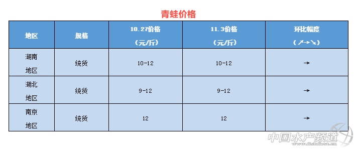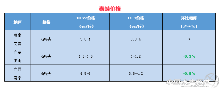 | 中國水產頻道原創報道, 本周牛蛙、泰蛙最新行情報價 文/ 水產前沿 陳曉慶 一周行情簡析 牛蛙 上周牛蛙價格上漲2到3毛,而本周又回落到4元/斤的水平。今日福建福州牛蛙現金價4元/斤,欠賬4.5元/斤。廣西南寧、廣東佛山8兩頭牛蛙報價3.8-4元/斤,海南文昌8兩頭報價0.2元/斤,相比上周下降了0.2元/斤。福建漳州5-9兩報價4.3元/斤。相比上周上漲了0.4元/斤。 往年農歷十月左右澄海牛蛙已經上市,今年行情低迷,澄海養殖戶不敢喂料,牛蛙上市較晚。部分缺蛙的收蛙商提價刺激養殖戶出蛙,周末蛙價開始出現上漲的趨勢。 泰國虎紋蛙 上周泰蛙4天時間內高漲1.5元/斤,然而本周卻又出現逆轉。廣西南寧6兩頭泰蛙今日報價3.8-4.2元/斤,相比上周下降了0.8元/斤,廣東佛山6兩頭報價4-4.2元/斤,相比上周下降了0.3元/斤,海南文昌今日報價3.8-4元/斤,價格平穩。 據悉,十月底泰蛙大蛙存欄量相比9月份減少了80%左右,蛙源較少;另一方面,蛙價低迷,泰蛙才剛開始出現上漲的苗頭,部分養殖戶還是選擇等價惜售。上周幾天時間升了1.5元,市場接受不了,便降低價格,想刺激養殖戶放棄等價出蛙。目前南方的天氣已經開始轉涼,泰蛙采食量下降,生長緩慢,大蛙存量在逐漸減少,市場上對于蛙肉的需求量也有所提升,蛙價近期有望再次上漲。 青蛙(黑斑蛙) 近期青蛙價格平穩,往年的這個時候青蛙價格已經開始回漲,而今年由于養殖量量較大,價格回升較慢。 |