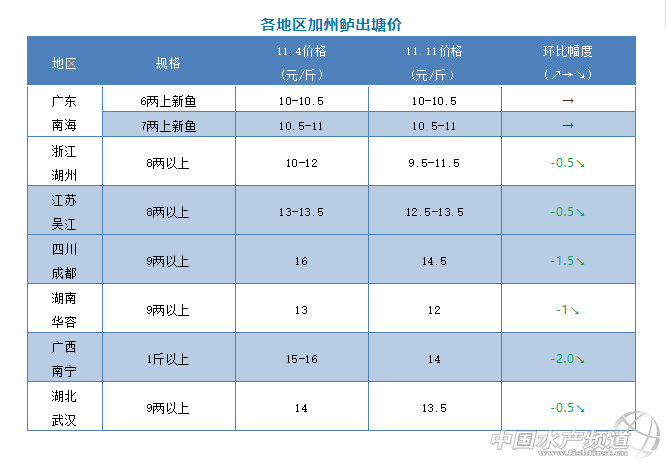 | 中國水產頻道原創報道, 文/圖 何氏水產、水產前沿 李靜 加州鱸 本周除廣東鱸魚價格保持穩定外,其它產區價格都比上周有所下跌,跌幅在0.5-2.0元/斤不等,特別是廣西南寧跌幅最大,達到2元/斤,其他產區也下跌了0.5-1.5元/斤。 1、廣東鱸魚現在新魚出魚量持續增加,由于現在開塘價格比較低,大部分養戶都選擇出7兩以上或者8兩以上的魚,導致本周大魚頭比例有所增加,丁小盧比例相對減少了,新魚魚頭1.5斤的數量比上周多了。本周新魚8兩上開塘價大概在12-12.5元/斤左右,6兩和7兩以上價格與上周一樣,6兩以上價格還是10-10.5元/斤,7兩以上價格在10.5-11元/斤,魚頭越大價格越高。近期外省水車到本地收魚增多,但養戶出魚積極性不是很高,目前魚價未達到養戶心理預期,想養大規格提高產量和賣價。 2、浙江湖州鱸魚新魚持續大量上市,價格和上周一樣,8兩以上價格還是10-12元/斤,本周銷量有所增多,養戶出魚積極性高,加上價格便宜,吸引了很多外地水車到本地收魚,當地魚價暫時保持穩定。今天吳江8兩上報價是12.5-13.5元/斤,比上周下跌了0.5元/斤,流通商對挑魚規格、質量要求較高,市場上大規格魚依然不是很多。四川成都鱸魚新魚也在大量出魚,價格也比上周再下跌了1.5元/斤。廣西南寧、湖南華容、湖北武漢本周價格也比上周下跌了0.5-2元/斤,主要是當地新魚目前大量上市,銷量不大,所以價格持續下跌。 |