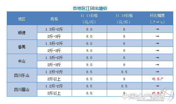 1、本周廣東江團價格保持穩定,小魚是8.0元/斤,中魚還是9.0元/斤,大魚3-4斤價格在7元/斤,4斤以上的6元/斤,目前市場行情差,銷量跟上周差不多,預計接下來價格變化不大。