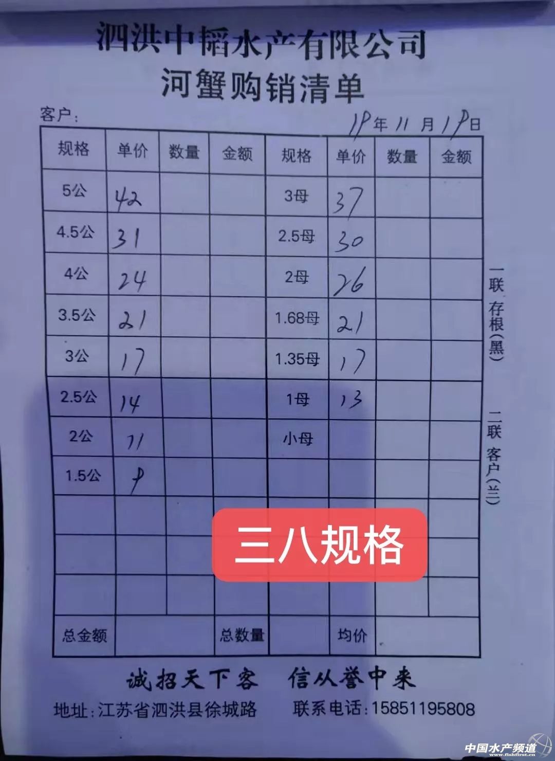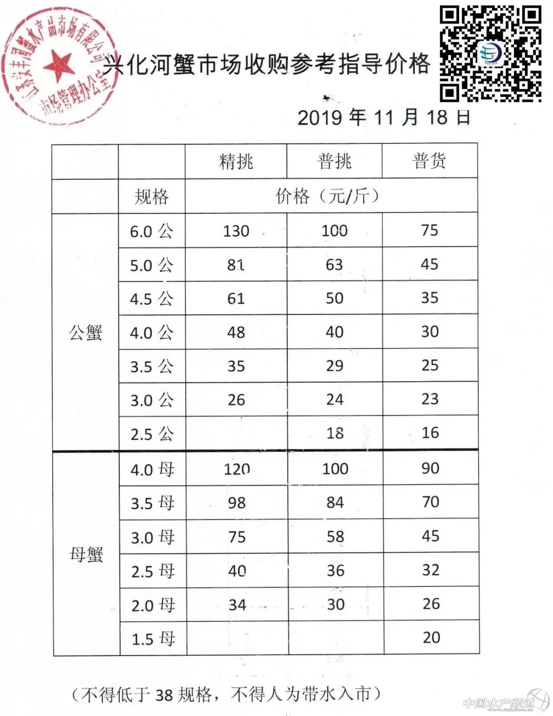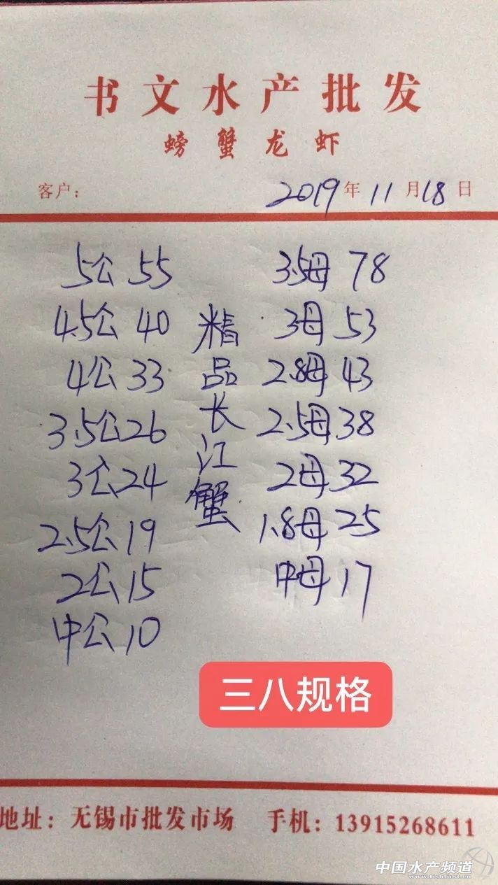 | 中國水產(chǎn)頻道報道, 興化蟹價平穩(wěn) 蝦蟹行情每日播報 您身邊的行情顧問 歡迎關(guān)注蝦蟹前沿公眾號! 最新行情解析 高淳 近期高淳精品蟹價波動較為明顯,自15日大跌后,近4天蟹價連續(xù)上漲,目前平均蟹價為近期最高,后市可期。但與去年同期相比,目前蟹價仍明顯偏低。 今天高淳精品門市價格變化較多,5公漲3元/斤,4.5公漲1元/斤,4公、3.5公均漲2元/斤。母蟹方面,3.5母漲5元/斤,3母漲1元/斤。其他規(guī)格蟹價未變。 興化 近期興化精挑蟹價整體呈上漲趨勢,與昨天相比,今天蟹價保持平穩(wěn)。同時,今天興化市場指導(dǎo)價普挑、普貨價格基本未變。 今日參考價 興化 高淳 此報價由江蘇好潤固城湖店劉坤提供 泗洪 此報價由泗洪孫老板提供 無錫 此報價由無錫王老板提供 宣城 此報價由宣城劉老板提供 |