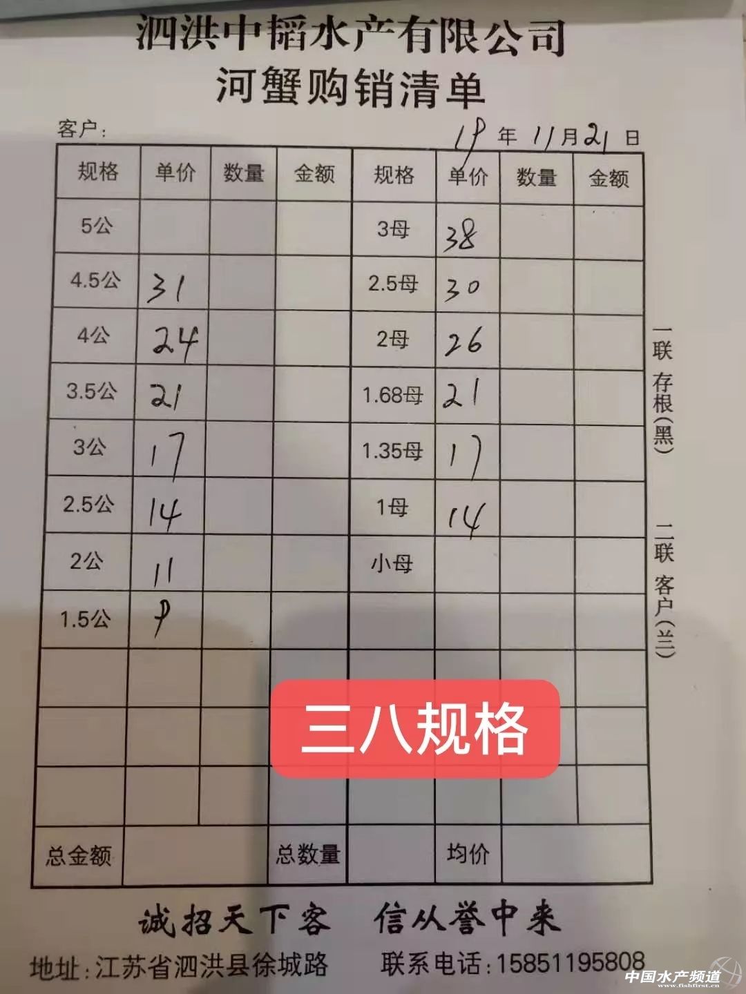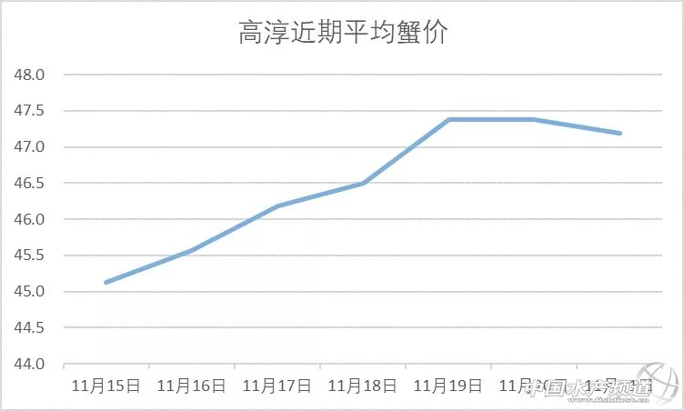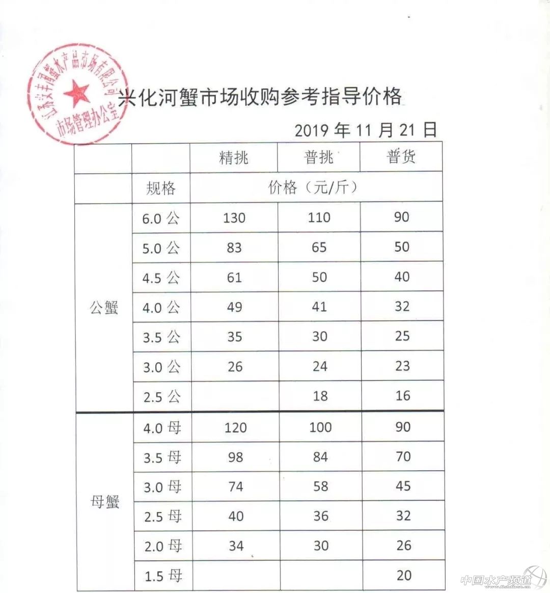 | 中國水產頻道原創報道, 興化整體上漲。 蝦蟹行情每日播報 您身邊的行情顧問 歡迎關注蝦蟹前沿公眾號! 最新行情解析 高淳 近期高淳精品蟹價整體呈上漲趨勢,不過今天略有下跌,目前平均蟹價為47.2元/斤。與去年同期相比,目前蟹價仍明顯偏低。 今天高淳精品門市4公、2.5母、2母均跌1元/斤,其他規格蟹價未變。 興化 近期興化精挑蟹價整體呈上漲趨勢,今天略有上漲,其中5公漲2元/斤,4公漲1元/斤。同時,今天興化市場指導價普挑、普貨價格均有所上漲。 今日參考價 興化 此報價由江蘇好潤馬家蕩店宋利坤提供 此報價由江蘇好潤馬家蕩店宋利坤提供 高淳 此報價由江蘇好潤固城湖店劉坤提供 泗洪 此報價由泗洪孫老板提供 無錫 此報價由無錫王老板提供 宣城 |