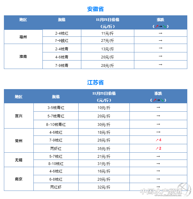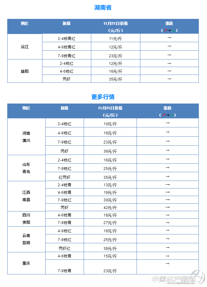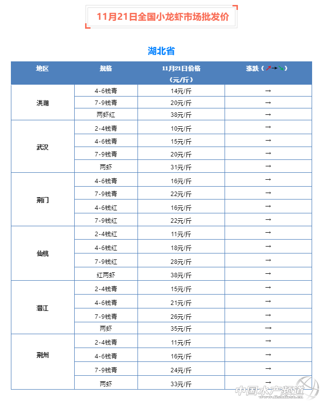 摘要: 中國水產頻道報道,11月21日全國小龍蝦市場批發價 。