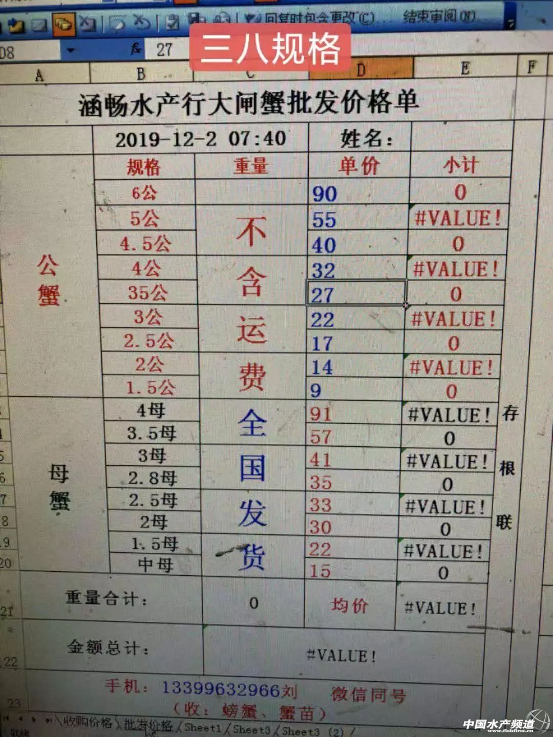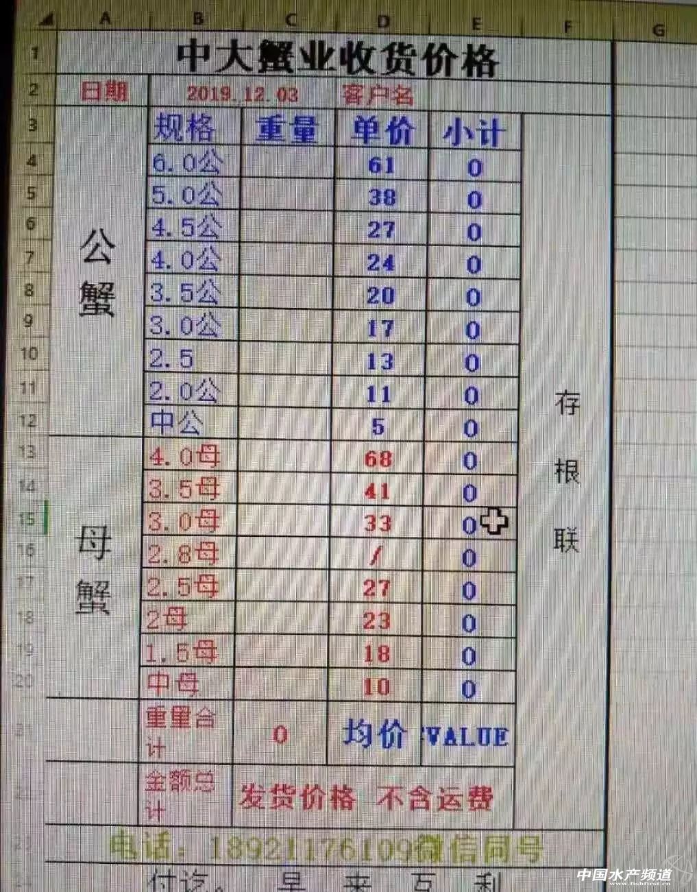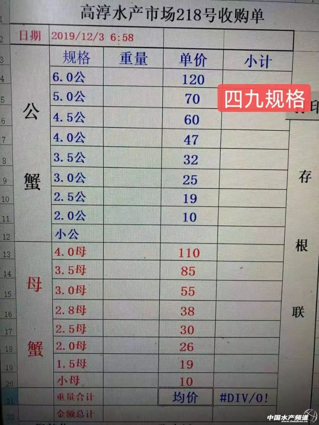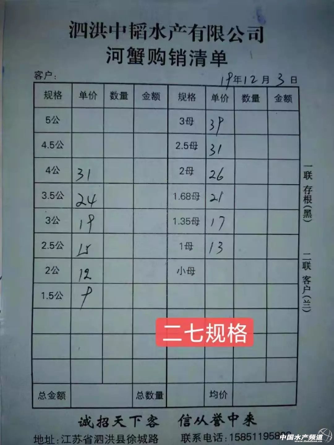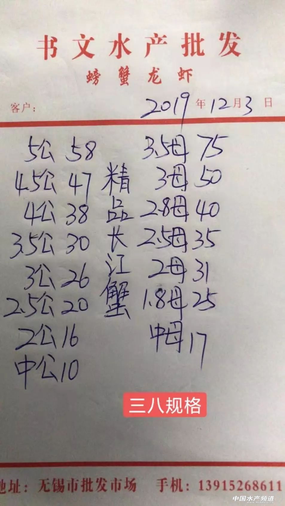 | 中國水產頻道原創報道, 蝦蟹行情每日播報 您身邊的行情顧問 歡迎關注蝦蟹前沿公眾號! 最新河蟹行情解析 高淳 近期高淳精品蟹價波動較為明顯,自1日上漲后,近兩天蟹價均保持平穩,目前平均蟹價為47.3元/斤。與去年同期相比,目前蟹價仍舊偏低。今天高淳精品門市各規格蟹價基本未變。 興化 近期興化精挑蟹價呈上漲趨勢,繼11月30日小幅上漲后,目前精挑蟹價保持平穩,今天各規格蟹價基本未變。 同時,今天興化市場指導價普挑、普貨價格均保持平穩。 今日河蟹參考價 興化 此報價來自江蘇安豐國蟹水產品市場 此報價由江蘇好潤馬家蕩店宋利坤提供 高淳 泗洪 此報價由泗洪孫老板提供 無錫 此報價由無錫王老板提供 宣城 |