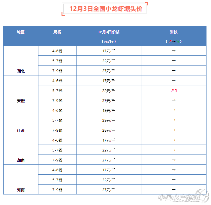 摘要: 中國水產頻道報道,12月3日全國小龍蝦塘頭價。