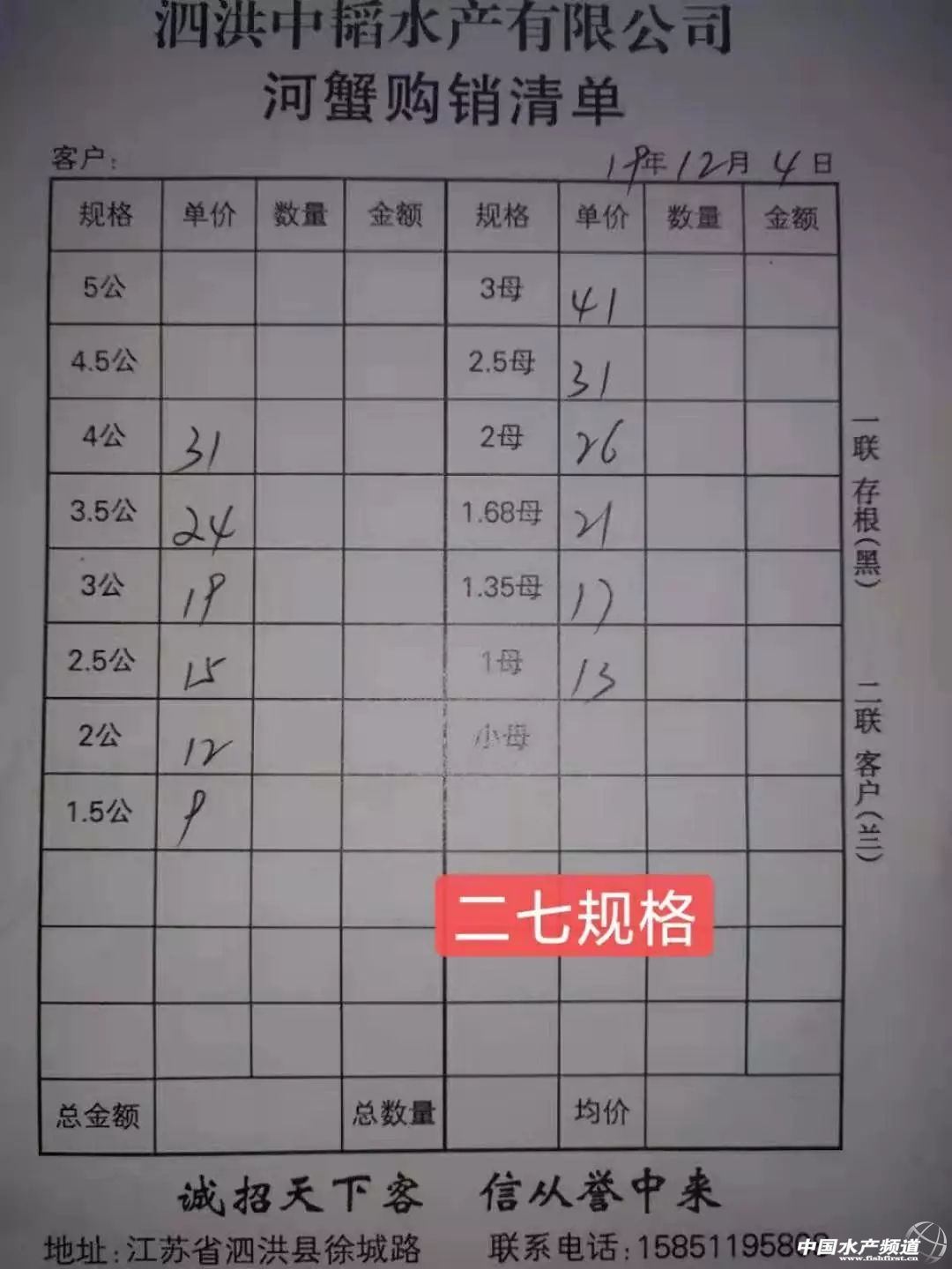 | 中國水產頻道原創報道, 最新河蟹行情解析 高淳 近期高淳精品蟹價波動較為明顯,今天蟹價小幅下滑。與去年同期相比,目前蟹價明顯偏低。今天高淳精品門市5公、4.5公均跌2元/斤,2.5母、2母均漲1元/斤,其他規格蟹價未變。 今日河蟹參考價 興化 此報價由江蘇好潤馬家蕩店宋利坤提供 高淳 此報價由江蘇好潤固城湖店劉坤提供 泗洪 此報價由泗洪孫老板提供 無錫 此報價由無錫王老板提供 宣城 |