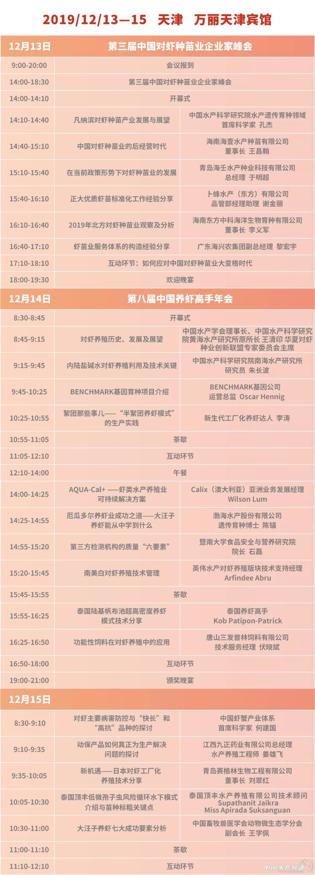 | 中國(guó)水產(chǎn)頻道獨(dú)家報(bào)道, 第八屆中國(guó)養(yǎng)蝦高手年會(huì) The 8th China Shrimp Masters Annual Meeting 國(guó)內(nèi)養(yǎng)蝦最成功者的年度聚會(huì) 主題:種苗選擇· 動(dòng)保創(chuàng)新· 飼料升級(jí)· 工業(yè)化 第三屆中國(guó)對(duì)蝦種苗業(yè)企業(yè)家峰會(huì) 中國(guó)南美白對(duì)蝦種苗業(yè)風(fēng)向標(biāo) 主題:南北合作 · 親蝦選擇 2019年12月13-15日·中國(guó)·天津 萬(wàn)麗天津賓館 第八屆中國(guó)養(yǎng)蝦 高手年會(huì)會(huì)議背景 December 2019 當(dāng)前,全球養(yǎng)殖對(duì)蝦產(chǎn)量已增長(zhǎng)到450萬(wàn)噸的體量,預(yù)計(jì)5年后將達(dá)到800-900萬(wàn)噸?梢哉f(shuō),對(duì)蝦養(yǎng)殖業(yè)仍然是全球水產(chǎn)業(yè)中最具活力和投資前景的熱土。 同樣,縱觀整個(gè)中國(guó)水產(chǎn)養(yǎng)殖業(yè),對(duì)蝦仍然是最有利可圖的大眾養(yǎng)殖品種。然而,中國(guó)蝦業(yè)與泰國(guó)、印度、越南等對(duì)蝦主產(chǎn)國(guó)一樣,正經(jīng)歷著由傳統(tǒng)向現(xiàn)代轉(zhuǎn)型的陣痛期,中國(guó)蝦業(yè)也呈現(xiàn)出新的發(fā)展特點(diǎn):新病舊患不斷使病原檢測(cè)成為熱門(mén)話題;種業(yè)混亂催生了種企與苗企多元化的合作新模式;國(guó)家替抗背景下生物發(fā)酵料、功能性飼料異軍突起;綠色發(fā)展政策指導(dǎo)下動(dòng)保創(chuàng)新迫在眉睫;國(guó)家降本增效倡導(dǎo)下先進(jìn)設(shè)備普及率越來(lái)越高……最令人振奮的是,傳統(tǒng)北方市場(chǎng)將在未來(lái)釋放出巨大的潛力,成為中國(guó)對(duì)蝦養(yǎng)殖業(yè)最大的增量市場(chǎng)。 從另一個(gè)角度,中國(guó)對(duì)蝦養(yǎng)殖業(yè)也呈現(xiàn)出令人興奮的發(fā)展趨勢(shì):對(duì)蝦板塊的投資逐漸增多,這是行業(yè)由傳統(tǒng)往現(xiàn)代發(fā)展的必然趨勢(shì)。產(chǎn)業(yè)的融合度也越來(lái)越高,此背景下價(jià)值鏈將迎來(lái)更加廣泛的發(fā)展。在這個(gè)發(fā)展過(guò)程中,中國(guó)養(yǎng)蝦業(yè)的機(jī)遇永遠(yuǎn)要大于挑戰(zhàn)。 因此,第八屆中國(guó)養(yǎng)蝦高手年會(huì)將以“挖掘下一個(gè)驅(qū)動(dòng)力”為背景,以“種苗選擇、動(dòng)保創(chuàng)新、飼料升級(jí)、工業(yè)化”為主題,議題將觸及全球?qū)ξr業(yè)鏈條中包括種苗、飼料、動(dòng)保、設(shè)備、流通等所有利益相關(guān)者,當(dāng)下他們有何科研成果、創(chuàng)新技術(shù)、前沿產(chǎn)品、養(yǎng)殖模式等解決方案,是所有從業(yè)人員最為關(guān)心的話題。 組織單位 主辦單位 天津市水產(chǎn)技術(shù)推廣站 國(guó)家蝦蟹產(chǎn)業(yè)技術(shù)體系 水產(chǎn)前沿 聯(lián)合主辦單位 華夏對(duì)蝦種業(yè)創(chuàng)新聯(lián)盟 天津市水產(chǎn)研究所 承辦單位 工業(yè)化水產(chǎn)圈 協(xié)辦單位 Calix Limited(澳大利亞) 英偉水產(chǎn)INVEAQUACULTURE 廈門(mén)源正龍生物科技有限公司 唐山三發(fā)普林飼料有限公司 江西九正藥業(yè)有限公司 廣州雙螺旋基因技術(shù)有限公司 廣東遂溪縣好仕達(dá)實(shí)業(yè)有限公司 江蘇好潤(rùn)生物科技有限公司 泰國(guó)頂豐水產(chǎn)養(yǎng)殖有限公司 支持單位 江蘇省東辛農(nóng)場(chǎng)水產(chǎn)養(yǎng)殖有限公司 湛江市對(duì)蝦苗種協(xié)會(huì) 如東縣南美白對(duì)蝦協(xié)會(huì) 工業(yè)化水產(chǎn)養(yǎng)殖聯(lián)盟 海南省對(duì)蝦養(yǎng)殖協(xié)會(huì) 浙江對(duì)蝦養(yǎng)殖協(xié)會(huì) 廣西對(duì)蝦養(yǎng)殖協(xié)會(huì) 惠東縣蝦業(yè)協(xié)會(huì) 金牌贊助 天津市漁生堂生物技術(shù)有限公司 廣州市旭路行電子有限公司 青島海壬水產(chǎn)種業(yè)科技有限公司 漁農(nóng)在線 煙臺(tái)大樂(lè)飼料有限公司 廣東海興農(nóng)集團(tuán)有限公司 海南阜康水產(chǎn)科技有限公司 正大集團(tuán) 銀牌贊助 上海綠奧生物科技有限公司 廣東廣盈生物技術(shù)有限公司 眾合發(fā)(北京)生物科技發(fā)展有限公司 海南中正水產(chǎn)科技有限公司 廣東海茂投資有限公司 北京漁經(jīng)生物技術(shù)有限責(zé)任公司 山東海博農(nóng)牧科技有限公司 河北奇驥生物技術(shù)有限公司 漁飛魚(yú)水產(chǎn) 縱海水產(chǎn)科技集團(tuán) 惠州市三寶生物化學(xué)科技有限公司 浙江富地機(jī)械有限公司 海南海聯(lián)水產(chǎn)種苗有限公司 臺(tái)州金湖機(jī)電有限公司 宜春強(qiáng)微生物科技有限公司 湛江市粵凱生物科技有限公司 SHRIMP IMPROVEMENT SYSTEMS GROUP PTE. LTD.(SIS公司) Syaqua日夜快集團(tuán) 江蘇國(guó)昌生物技術(shù)有限公司 香港豐華貿(mào)易發(fā)展有限公司 海壹水產(chǎn)種苗有限公司 廣州華峰生物科技有限公司 唐山宏利飼料有限公司 海南寶萊海洋生物科技有限公司 湛江騰飛實(shí)業(yè)有限公司 天津市創(chuàng)嘉生物技術(shù)有限公司 廈門(mén)喜大生物科技有限公司 廈門(mén)龍程水產(chǎn)科技有限公司 海南祿泰海洋生物科技有限公司 青島賽格林生物工程有限公司 廣東恒興飼料實(shí)業(yè)股份有限公司 廣東綠百多生物開(kāi)發(fā)有限公司 湛江粵海水產(chǎn)種苗有限公司 廈門(mén)市新榮騰水產(chǎn)技術(shù)開(kāi)發(fā)有限公司 海南泰陽(yáng)種業(yè)有限公司 海南