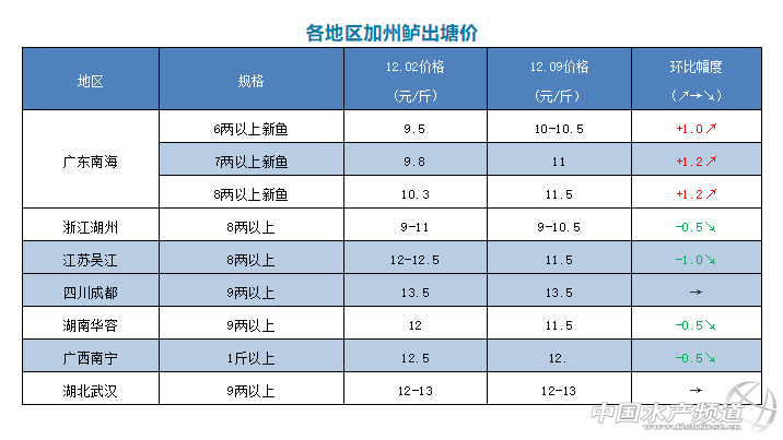 | 中國水產頻道原創報道, 文/圖 何氏水產、水產前沿 李靜 加州鱸 本周廣東佛山加州鱸魚價有1-1.2元/斤的上漲,其它產區呈穩中有降態勢,分別有0.5-1.0元/斤的跌幅。 1、 本周廣東鱸魚8兩上開塘價在11.5元/斤,上漲了1.2元/斤;7兩以上價格是11.0元/斤,比上周也上漲了1.2元/斤;6兩上價格是10-10.5元/斤,也上漲了1.0元/斤。由于前段時間佛山出魚價格持續下滑,當地養戶惜售心理增強,出魚意愿很低,隨著冷空氣南下,外省水車增多,流通魚為提高養戶出魚積極性而上調魚價,預計接下來或許還會有上浮空間。 2、本周浙江湖州統貨報價9-10.5元/斤左右,魚價比上周跌了0.5元/斤,具體價格要看魚頭大小和規格成而定,湖州本地養戶出魚積極性較高,以出統貨為主。江蘇吳江目前8兩上報價11.5元/斤左右,比上周下跌了1.0元/斤,目前魚價未達到養戶心理預期,本地養戶出魚積極性不高。四川成都9兩上報價13.5元/斤,跟上周持平,隨著天氣轉冷,養戶出魚積極性有所下降,出魚以大規格魚居多,以提高產量和效益。湖北武漢本周保持穩定,9兩上報價12-13元/斤,本地達上市規格的魚不多,加上魚價未達養戶預期,出魚量不大。湖南華容9兩上報價11.5元/斤,比上周下跌了0.5元/斤,當地達上市規格的存魚不多,養戶出魚積極性不高,當地魚中多到周邊區域收魚。廣西南寧1斤上報價12.0元/斤,比上周也下跌了0.5元/斤,當地養戶出魚積極性較高,出魚量略有增加,但總體走量不大。 |