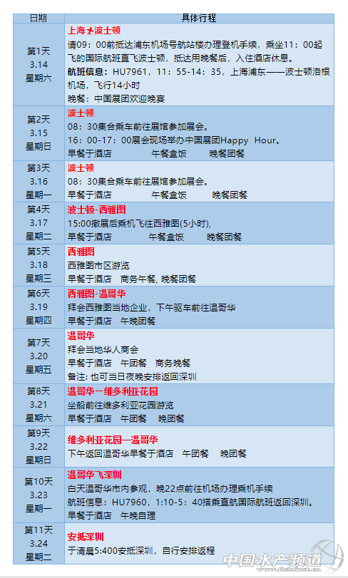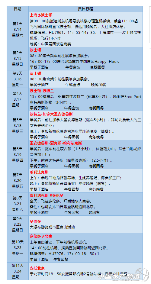 | 中國水產(chǎn)頻道報(bào)道, 近兩年中美經(jīng)貿(mào)摩擦曲折起伏,中美水產(chǎn)品貿(mào)易受到嚴(yán)重影響,但美國依然是中國重要的水產(chǎn)品貿(mào)易伙伴,市場地位不容忽視。作為評估美國水產(chǎn)品市場走勢的晴雨表,北美水產(chǎn)展將于2020年3月15-17日在美國波士頓如期舉行。 北美水產(chǎn)展是產(chǎn)業(yè)了解美洲市場、獲得美國訂單的重要渠道,中國水產(chǎn)和流通加工協(xié)會(huì)作為全國最具實(shí)力的官方組團(tuán)單位將繼續(xù)組織我國水產(chǎn)企業(yè)參展觀展。此外,展會(huì)期間還將舉行中國展團(tuán)歡迎晚宴,聯(lián)合美國漁業(yè)協(xié)會(huì)(NFI)開展“中美漁業(yè)企業(yè)對話”,并在展位現(xiàn)場舉辦中國展團(tuán)Happy Hour;展會(huì)后則組織企業(yè)前往加拿大新布倫瑞克省和新斯科舍省拜會(huì)當(dāng)?shù)貪O業(yè)政府部門和海產(chǎn)企業(yè),為產(chǎn)業(yè)界創(chuàng)造更多的合作機(jī)會(huì)。現(xiàn)組團(tuán)工作已正式開始,誠摯歡迎業(yè)界人士報(bào)名參展參團(tuán)。 A行程:波士頓7天參展團(tuán) 行程特色: 1.國際往返海南航空直飛,免去轉(zhuǎn)機(jī)辛苦; 2.酒店:波士頓入住市區(qū)唐人街Park Plaza Hotel(廣場公園酒店),距離展館3公里,商場超市購物便利,多家中國餐館可選性多,滿足你的中國胃; 3.布展當(dāng)天安排奧特萊斯購物,享受北美最低消費(fèi)稅。 B行程:波士頓+加拿大新布倫瑞克省+新斯科舍省+多倫多 行程特色: 1.國際往返海南航空直飛,免去轉(zhuǎn)機(jī)辛苦; 2.酒店:波士頓入住市區(qū)唐人街Park Plaza Hotel(廣場公園酒店),距離展場3公里,商場超市購物便利,多家中國餐館可選性多,滿足你的中國胃; 3.展會(huì)結(jié)束后前往北美最大龍蝦集散地及加拿大海產(chǎn)大省新不倫瑞克(NB)和新斯科舍(NS)省,拜會(huì)當(dāng)?shù)貪O業(yè)政府部門及參觀當(dāng)?shù)睾.a(chǎn)企業(yè); 4.前往多倫多,拜會(huì)當(dāng)?shù)厝A人企業(yè)。 C行程:波士頓+西雅圖+加拿大溫哥華 (備選行程, 15人以上成團(tuán)) 行程特色: 1.國際往返海南航空直飛,免去轉(zhuǎn)機(jī)辛苦; 2.酒店:波士頓入住市區(qū)唐人街Park Plaza Hotel(廣場公園酒店),距離展場3公里,商場超市購物便利,多家中國餐館可選性多,滿足你的中國胃; 3.展會(huì)結(jié)束后前往美國西海岸西雅圖及加拿大溫哥華拜會(huì)當(dāng)?shù)貪O業(yè)政府部門及參觀當(dāng)?shù)睾.a(chǎn)企業(yè)。 參團(tuán)細(xì)節(jié)及費(fèi)用,敬請來電咨詢。中國水產(chǎn)流通與加工協(xié)會(huì)還可根據(jù)您的要求制定特殊行程。聯(lián)系人及電話:孫雅玲13801301781;劉松18612109214 本次加拿大活動(dòng)得到加拿大大西洋商會(huì)與加拿大BC省國際貿(mào)易投資辦公室的鼎力支持,特此鳴謝! |