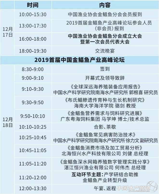 | 中國水產頻道報道, 2019年12月17-18日,“2019首屆中國金鯧魚產業高峰論壇”將于廣東湛江舉辦,同期,將舉辦“中國漁業協會金鯧魚分會成立大會” 文/ 水產前沿 李曉欣 2019首屆中國金鯧魚產業高峰論壇 同期舉辦:中國漁業協會金鯧魚分會成立大會 會議背景 金鯧魚是我國主要三大海水經濟魚類之一,因其肉質鮮美、鹽水適應度極廣、飼料馴化程度高、生長周期相對較短、銷售渠道廣闊,近年越來越受到廣大養殖戶的青睞。目前,金鯧魚在我國主產區分布于廣東粵西、廣西沿海、海南和福建南部沿海,以木排網箱和深海網箱養殖為主。金鯧魚產品除供應沿海幾個省份外,還遠銷到東北、華北、華中等內陸地區,已成為消費市場上海水養殖品種中的當家品種之一。2019年,金鯧魚養殖產量估計已突破15萬噸以上,整個產業產值近100億元。 然而,在發展迅猛的同時,金鯧魚產業亦面臨著諸多挑戰,比如良種短缺、臺風、赤潮、小瓜蟲等病害頻發常重創各大主養區、飼料技術配方門檻仍在、消費市場和流通渠道受限、成品魚價格低迷、內港禁限養整治等問題不斷突顯,產業亟需轉型升級。 鑒于此,2019年12月17-18日,由中國漁業協會金鯧魚分會(籌)主辦,水產前沿、工業化水產圈承辦的“2019首屆中國金鯧魚產業高峰論壇”將于廣東湛江舉辦,同期,將舉辦“中國漁業協會金鯧魚分會成立大會”,聚集行業專家學者、各板塊主流企業、養殖業者、飼料經銷商、流通商等,全面直擊金鯧魚產業發展的痛點和機遇,共話金鯧魚產業未來。 會議主題 綠色·合力·轉型·機遇 會議時間與地點 會議時間:12月17-18日 會議地點:廣東·湛江·花園酒店 組織單位 主辦單位: 中國漁業協會金鯧魚分會(籌) 承辦單位: 水產前沿 工業化水產圈 協辦單位: 廣東粵海飼料集團股份有限公司 廣東恒興飼料實業股份有限公司 金牌贊助: 湛江海大飼料有限公司 支持單位: 中國漁業協會漁船漁港分會 中國漁業協會水產動保分會 中國漁業協會智慧漁業分會 中國漁業協會江蘇代表處 中國漁業協會重慶代表處 廣東海洋大學機械與動力工程學院 銅合金網衣網箱健康養殖產業聯盟 山西漁業協會 中國水產養殖網 參展單位: 湛江經緯實業有限公司 會議日程 報告嘉賓簡介 參會詳情 簽到時間與地點 17號簽到:10:00-17:30在會議酒店一樓大堂 18號簽到:8:30-9:00在會議酒店三樓-花好月圓廳外廊 會議地點:花園酒店·花好月圓1廳(三樓) 宴設地點:花園酒店·花好月圓2廳(三樓) 溫馨提醒: 敬請參會嘉賓遵守大會流程時間,提前10分鐘進入會場,會場如有臺卡請按臺卡位置就坐; 會議期間請著正裝、佩戴胸牌參會; 本次會議不設PPT拷貝處,請與會嘉賓認真聽課、分享和交流; 由于部分專家報告內容不對外公布,PPT內容僅在會議現場展示。與會嘉賓拍攝PPT請不要外傳。 為保證會場衛生和嘉賓安全,吸煙請移步吸煙區,并將垃圾投入指定位置。 如遇突發情況,請配合會場工作人員指導; 會議期間敬請將手機調至靜音狀態,妥善保管好會議材料與個人物品。 酒店與路線 天氣預報 12月17日:多云,氣溫20-25℃ 12月18日:多云,氣溫19-25℃ 湛江美食 白灼蝦 豐富的海鮮品 白切雞 湛江生蠔 炒泥丁 湛江美景 南極村 硇洲島 吉兆灣 |