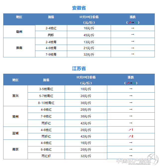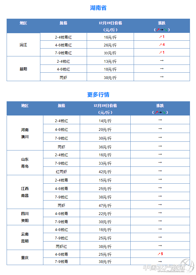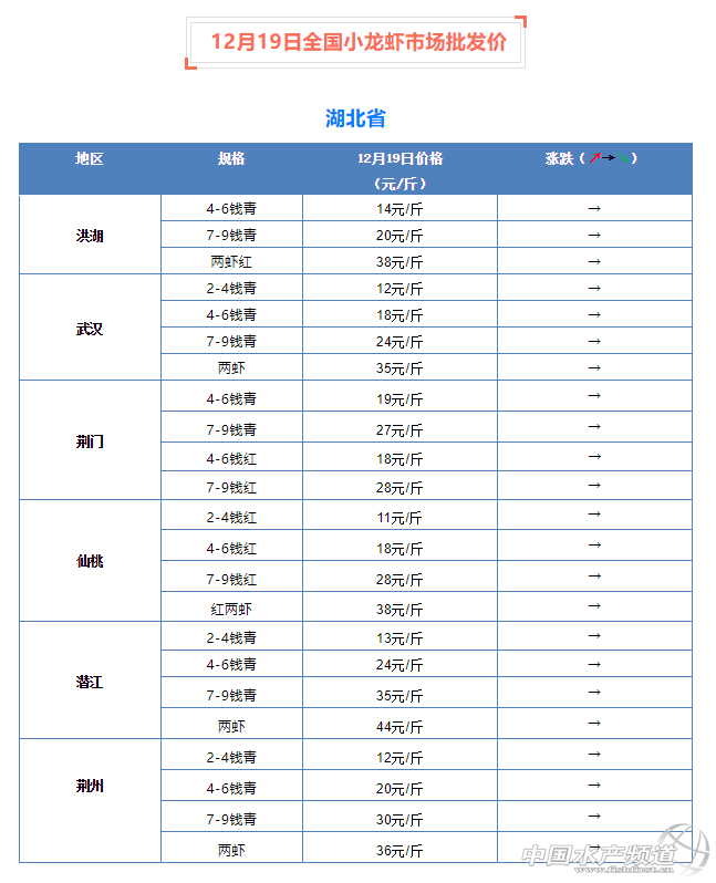 摘要: 中國水產頻道報道,12月19日全國小龍蝦市場批發價。