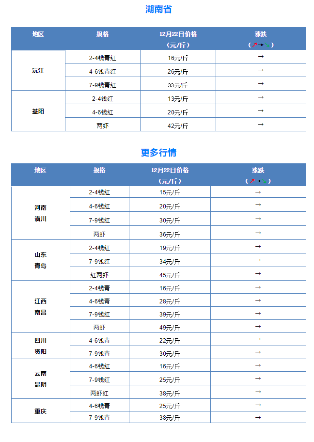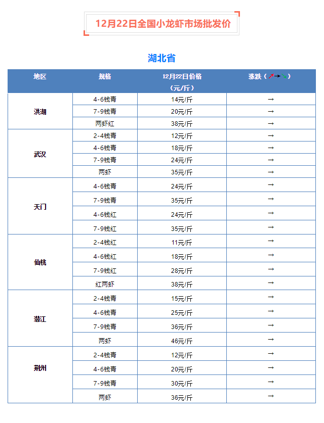 摘要: 中國水產頻道報道,12月22日全國小龍蝦市場批發價。