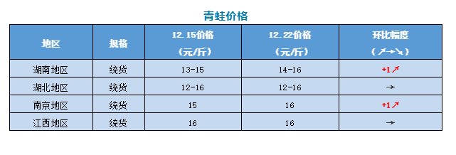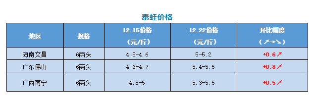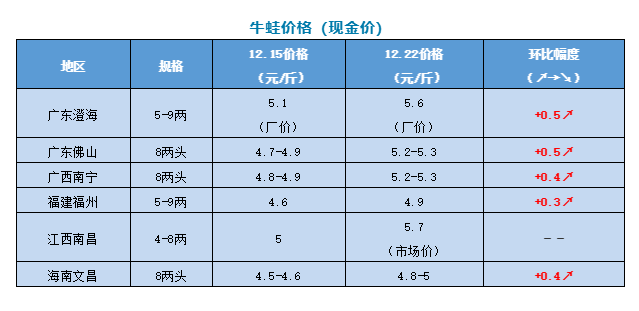 | 中國水產頻道原創報道, 拒絕一刀切,澄海牛蛙整治行動初見成效。本周牛蛙、泰蛙、青蛙最新行情報價 文/ 水產前沿 陳曉慶 本周要聞 拒絕一刀切,澄海牛蛙整治行動初見成效 12月16日,澄海區政府在鹽鴻鎮召開牛蛙養殖污染專項整治工作推進會,部署下階段牛蛙養殖污染整治工作措施。 區委常委林典發召開會議聽取各鎮各相關部門牛蛙養殖污染整治工作情況匯報。今年來,區委區政府高度重視,按照省委巡視組反饋問題,各方聯合行動落實整改,全面推進牛蛙養殖污染專項整治工作。階段來,養殖場病死牛蛙亂丟棄污染問題得到根本治理,牛蛙養殖尾水排放整改率大幅提升,大劑量使用抗生素現象得到遏制,整治工作取得一定成效。 林典發要求各鎮各部門要做好牛蛙養殖污染整治,加大常態化檢查力度,及時糾正養殖戶違規違法行為;強化執法監管,加大對獸藥門店、尾水排放、蛙體藥殘超標、違規挖田造池等巡查力度,發現違法違規行為堅決予以打擊取締,限期落實整改,加密對蛙體藥殘和排放尾水的抽查檢測,對使用禁用藥品和尾水超標排放的養殖戶依法從嚴查處。同時要健全牛蛙養殖戶備案管理制度,發揮牛蛙產業協會作用,加大宣傳力度,確保牛蛙達標、規范養殖。 禁養對于很多養蛙人來說,真的是讓人欲哭無淚。原本傾盡家產想著靠養蛙來養家糊口實現致富,最后虧得一塌糊涂。南寧市武鳴區一直是牛蛙養殖規模較大的地區,但因靠近飲用水源,生態環境、食品安全受到威脅,近期當地出臺公告禁養也是無奈之舉(詳見《牛蛙全線飆紅最高漲0.8元/斤,風云不定,廣西千畝蛙塘卻首遭禁養|金浦飼料特約》)。面對要被關閉的養殖場,許多養殖戶已經身心乏力,現在只有處理掉養殖場里的牛蛙,配合禁養通告了,等到春節過后再另尋出路。 而今年澄海地區對于牛蛙養殖污染的專項整治工作,讓我們看到了處理牛蛙養殖污染問題時除了禁養之外的另一條出路:通過加大對牛蛙養殖的監管和整改,來確保牛蛙達標、規范養殖,牛蛙養殖與生態環境也能實現共存。 本周價格行情簡析 牛蛙 本周牛蛙價格全線上漲,廣東地區漲幅最大,相比上周上漲了0.5元/斤,澄海牛蛙最高收5.6-5.7元/斤(廠價)。澄海地區近期蛙價接連上漲,但養殖戶的出蛙熱情并不高,主要是因為目前手頭上的大蛙并不多,也有一些養殖戶還在觀望價格。廣西地區本周8兩頭牛蛙報價5.2-5.3元/斤,相比上周上漲了0.4元/斤,目前看來武鳴區的禁養公告對于廣西整體蛙價的影響并不是很大。江西地區流通商吳老板表示,目前江西地區都是小蛙,大蛙也所剩不多了。 近期天氣轉冷,且目前正值冬至、元旦雙節期間,寒假、春節也即將來臨,市場需求有所上漲,近期牛蛙行情整體呈上漲趨勢。 泰國虎紋蛙 本周泰蛙也是全線飄紅。廣東佛山牛蛙漲幅最高,達到0.8元/斤。廣西、海南地區也有0.6-0.5元/斤的上漲。目前泰蛙存欄減少,冷空氣接連來襲,生長緩慢,目前市場有些供不應求。 青蛙(黑斑蛙) 本周黑斑蛙穩中有漲價。湖南、南京地區有1元/斤左右的漲幅,湖北、江西地區價格穩定。目前青蛙供應量逐步減少,青蛙價格正處于緩慢上升的階段。 |