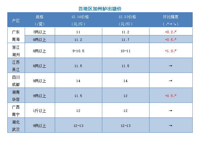 | 中國水產(chǎn)頻道原創(chuàng)報(bào)道, 文/圖 何氏水產(chǎn)、水產(chǎn)前沿 李靜 加州鱸 1、本周廣東鱸魚8兩上開塘價(jià)比上周上漲了0.5元/斤,7兩以上比上周上漲了0.2元/斤,實(shí)際塘頭價(jià)格根據(jù)魚頭大小和規(guī)格不同略有浮動(dòng)。近期外省水車到廣東收魚有所增多,市場流通速度加快,行情也有所好轉(zhuǎn)。 2、本周浙江湖州統(tǒng)貨比上周上漲了0.5-1.0元/斤,具體價(jià)格要看魚頭大小和規(guī)格成而定,主要受廣東魚價(jià)回升影響,本地養(yǎng)戶出魚積極性比之前有所降低。江蘇吳江價(jià)格本周持穩(wěn),目前魚價(jià)未達(dá)到養(yǎng)戶心理預(yù)期,本地養(yǎng)戶出魚積極性不高,出魚量很少。四川成都9兩上魚價(jià)與上周持平,目前價(jià)格養(yǎng)戶出魚積極性較高。湖北武漢本周保持穩(wěn)定,本地達(dá)上市規(guī)格的魚不多,加上魚價(jià)未達(dá)養(yǎng)戶預(yù)期,出魚量不大。湖南華容魚價(jià)9兩上比上周上漲了0.5元/斤,受廣東魚價(jià)上漲影響,加上當(dāng)?shù)剡_(dá)上市規(guī)格的存魚不多,出魚量較少。廣西南寧1斤上報(bào)價(jià)12.0元/斤,魚價(jià)保持穩(wěn)定,當(dāng)?shù)剡_(dá)上市規(guī)格的魚不多,總體走量不大。 |