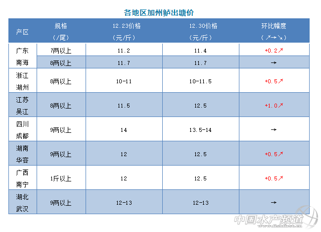 | 中國水產頻道原創報道, 文/圖 何氏水產、水產前沿 李靜 加州鱸 本周除四川成都、湖北武漢兩大產區價格保持穩定外,其他產區都有0.2-1.0元/斤不等的漲幅。 1、本周廣東鱸魚8兩上開塘價保持穩定,還是11.7元/斤;7兩以上價格在11.4元/斤,比上周也上漲了0.2元/斤;實際塘頭價格根據魚頭大小和規格不同略有浮動。受元旦假日影響,本周銷量增長明顯,但部分養戶出魚積極性依然不高,引起魚價小幅上漲。 2、本周浙江湖州統貨報價10-11.5元/斤,比上周上漲了0.5元/斤,具體價格要看魚頭大小和規格成而定,主要受廣東魚價回升影響,加上臨近元旦,當地養戶出魚積極性有所提高。江蘇吳江8兩上報價12.5元/斤,比上周上漲了1.0元/斤,本地養戶出魚積極性較低,總體出魚量不大。四川成都9兩上報價13.5-14元/斤,魚價與上周持平,受其它產區價格上漲影響,本地養戶看好后市行情,出魚積極性降低。湖北武漢本周保持穩定,9兩上報價12-13元/斤,本地達上市規格的魚不多,加上魚價未達養戶預期,出魚量不大。湖南華容魚價9兩上報價12.5元/斤,比上周上漲了0.5元/斤。受廣東魚價上漲影響,加上當地達上市規格的存魚不多,出魚量較少。廣西南寧1斤上報價12.5元/斤,魚價比上周上漲了0.5元/斤,主要受廣東等地區魚價上漲影響,但部分養戶看好后市行情,出魚積極性依然不高。 |