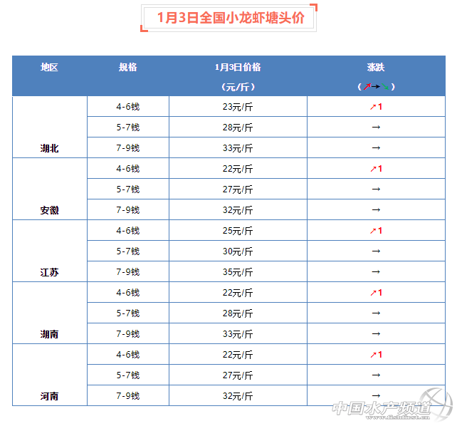 摘要: 中國水產(chǎn)頻道報(bào)道,1月3日全國小龍蝦塘頭價(jià) 。