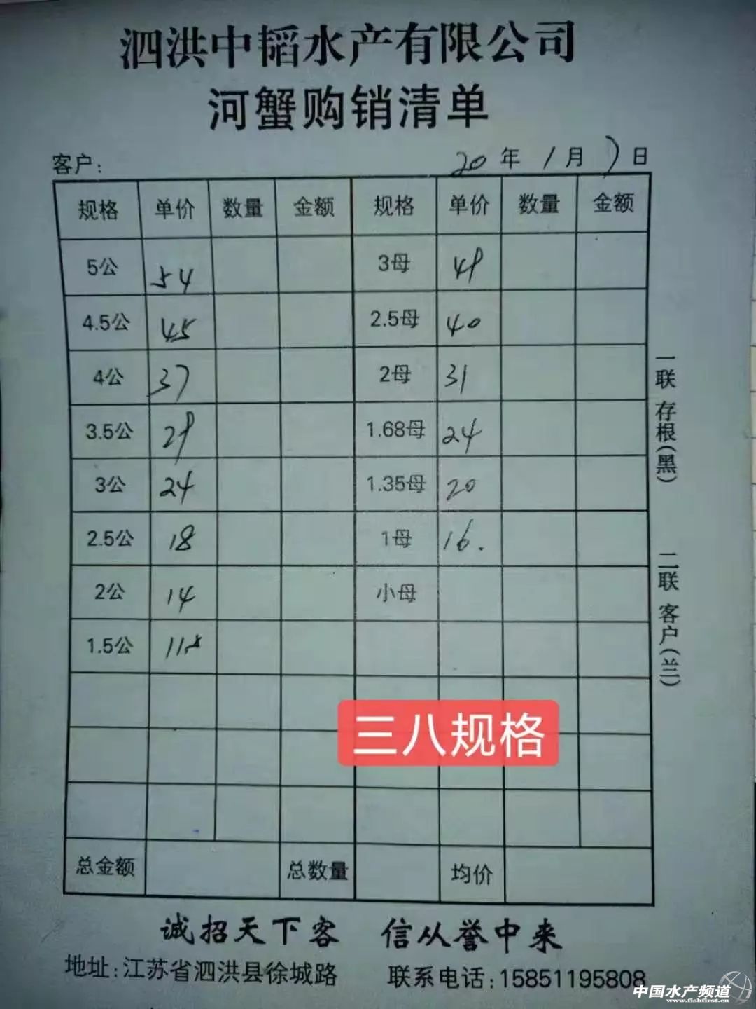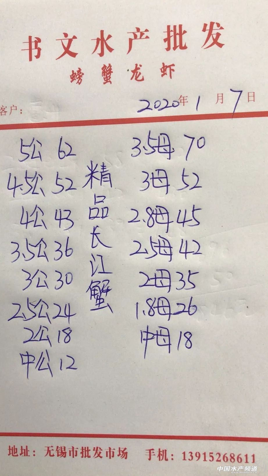 | 中國(guó)水產(chǎn)頻道原創(chuàng)報(bào)道, 扣蟹參考價(jià) 高淳 水陽(yáng) 盤(pán)錦 成蟹行情解析 高淳 近期高淳精品蟹價(jià)非常平穩(wěn),今天各規(guī)格蟹價(jià)基本未變,目前平均蟹價(jià)為42.6元/斤。與去年同期相比,目前蟹價(jià)明顯偏低。 興化 近期興化普蟹價(jià)格繼4日微跌后,近三天蟹價(jià)保持平穩(wěn),今天各規(guī)格蟹價(jià)基本未變,目前平均蟹價(jià)為25.5元/斤。 成蟹參考價(jià) 高淳 此報(bào)價(jià)由高淳倪老板提供 興化 此報(bào)價(jià)由興化丁老板提供 泗洪 此報(bào)價(jià)由泗洪孫老板提供 泗洪 此報(bào)價(jià)由無(wú)錫王老板提供 |