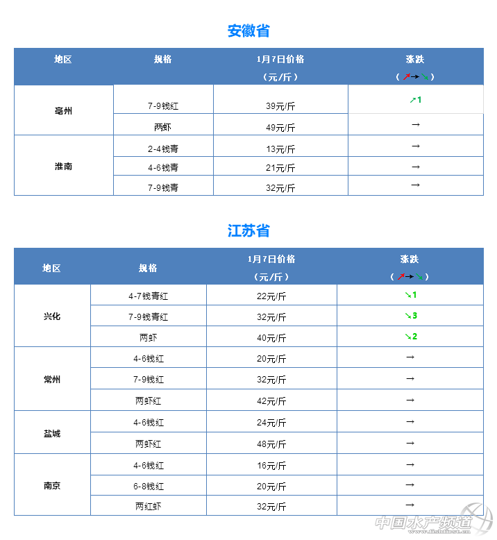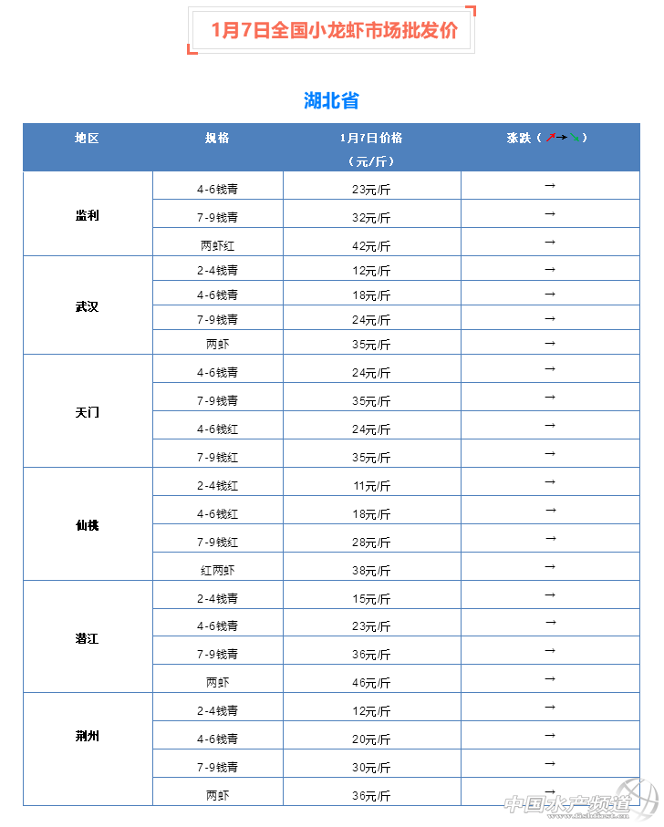 摘要: 中國水產(chǎn)頻道報道,1月7日全國小龍蝦市場批發(fā)價。